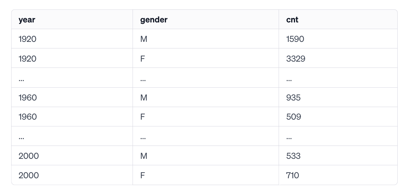 이는 'Jessie'라는 이름을 가진 개인에 대한 레코드를 선택하고 그들을 1920년부터 2000년까지 태어난 순으로 그룹화하며 COUNT(*)를 통해 각 그룹의 레코드 수를 세어 'year', 'gender', 'cnt'라는 열이있는 테이블을 생성합니다. 또한 이 테이블을 'year' 및 'gender'를 기준으로 내림차순으로 정렬합니다.
