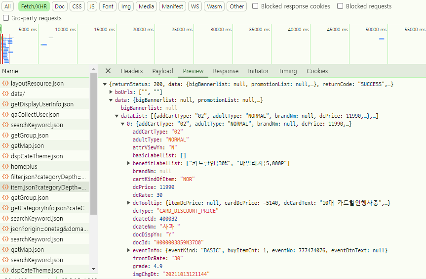 아래 코드는 어떤 api를 호출해서 상품명과 가격을 추출하는