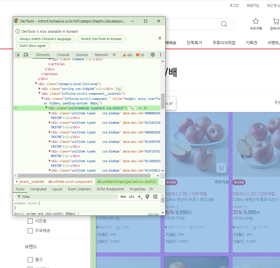홈플러스에서 사과, 배 카테고리 데이터 가져오기