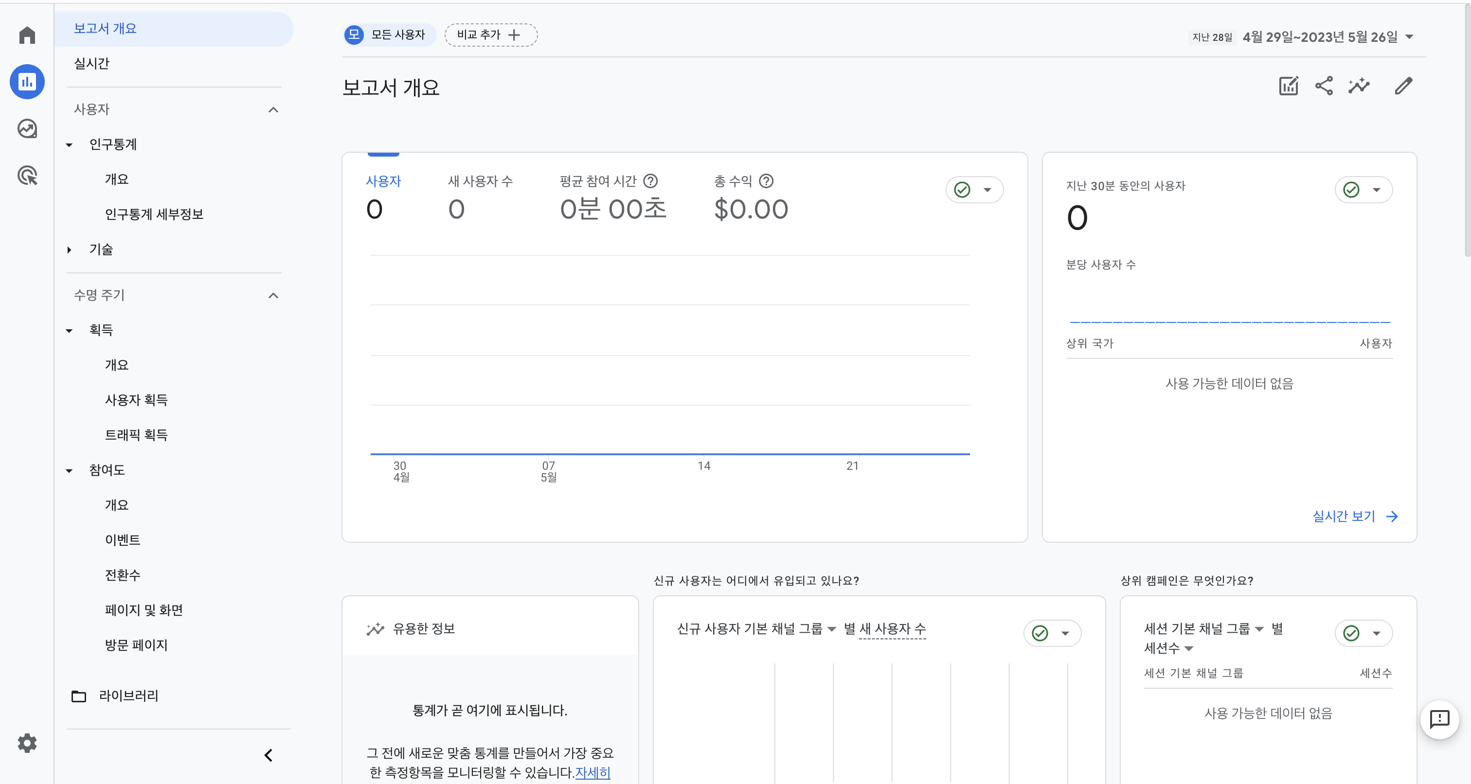 GA의 대시보드를 보면 ‘인구통계’, ‘사용자 및 새 사용자 수’, ‘평균 참여 시간’, ‘트래픽 획득’ 등의 데이터를 제공해주는 것을 확인하실 수 있습니다.