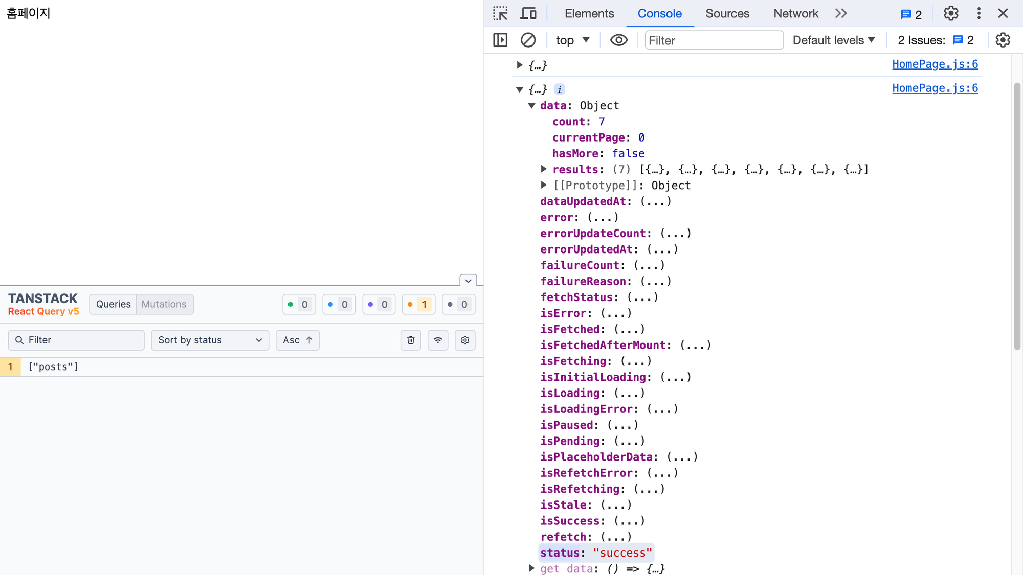 데이터를 성공적으로 받았다면 query status는 'success'가 되고, 만약 데이터를 받아오는 과정에서 에러가 발생했다면 'error' 상태가 됩니다.
