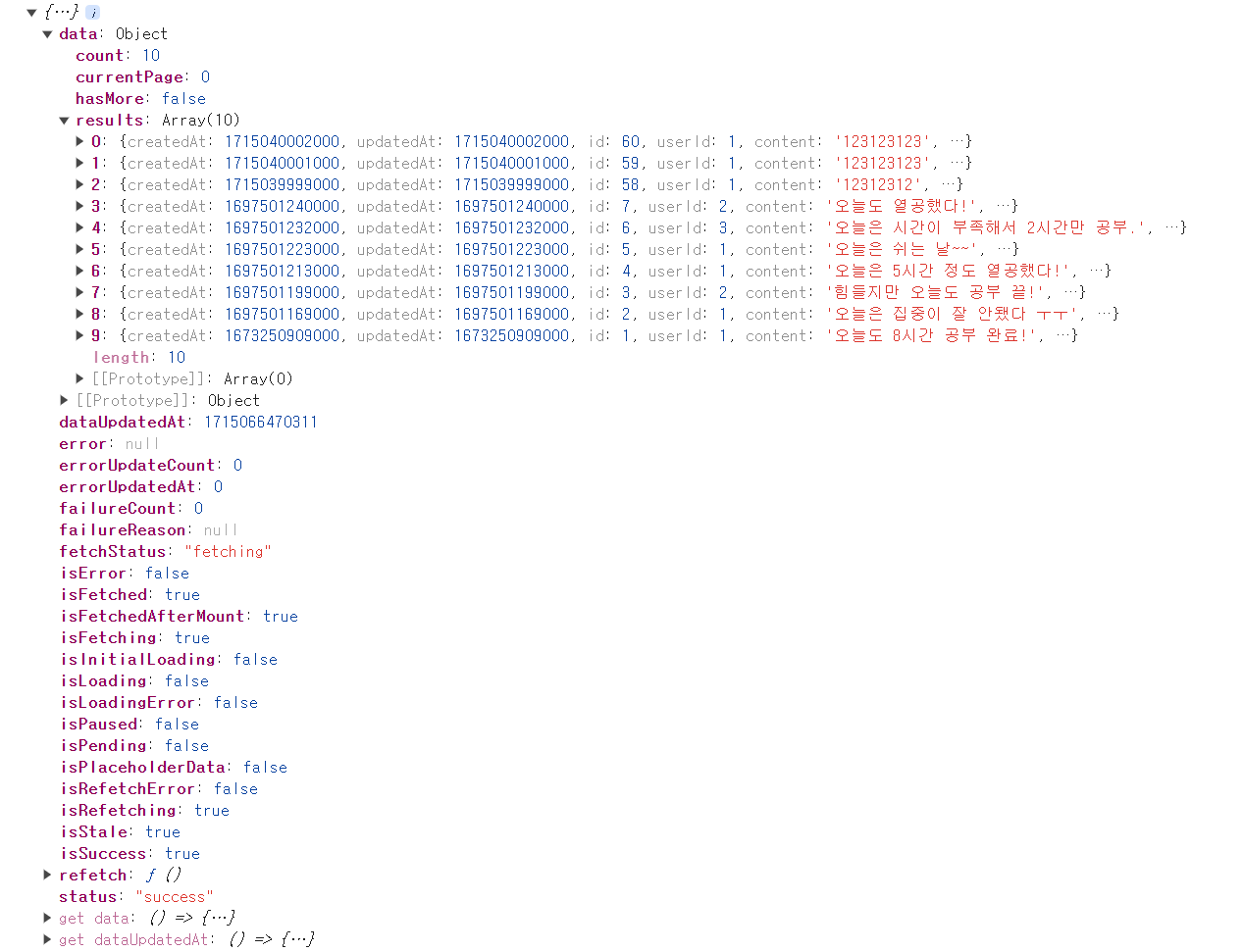 그다음에 isError, isFetched, isPending, isPaused, isSuccess와 같은 다양한 상태 정보도 확인해 볼 수 있고요. status라는 항목에는 success라고 적혀있는 걸 보니 데이터를 성공적으로 받아왔다는 뜻인 것 같습니다.