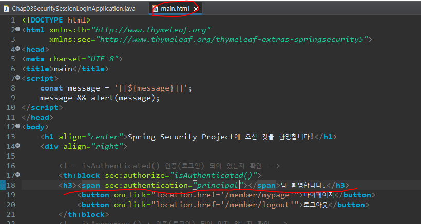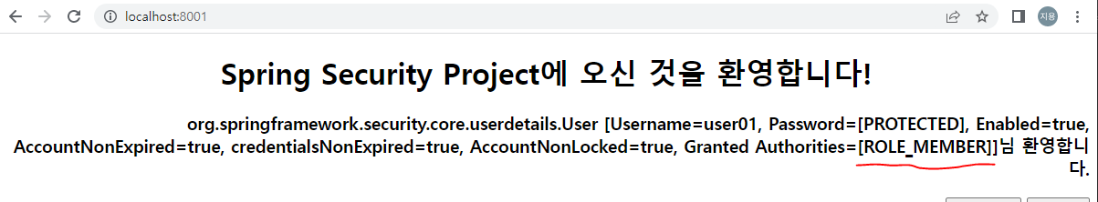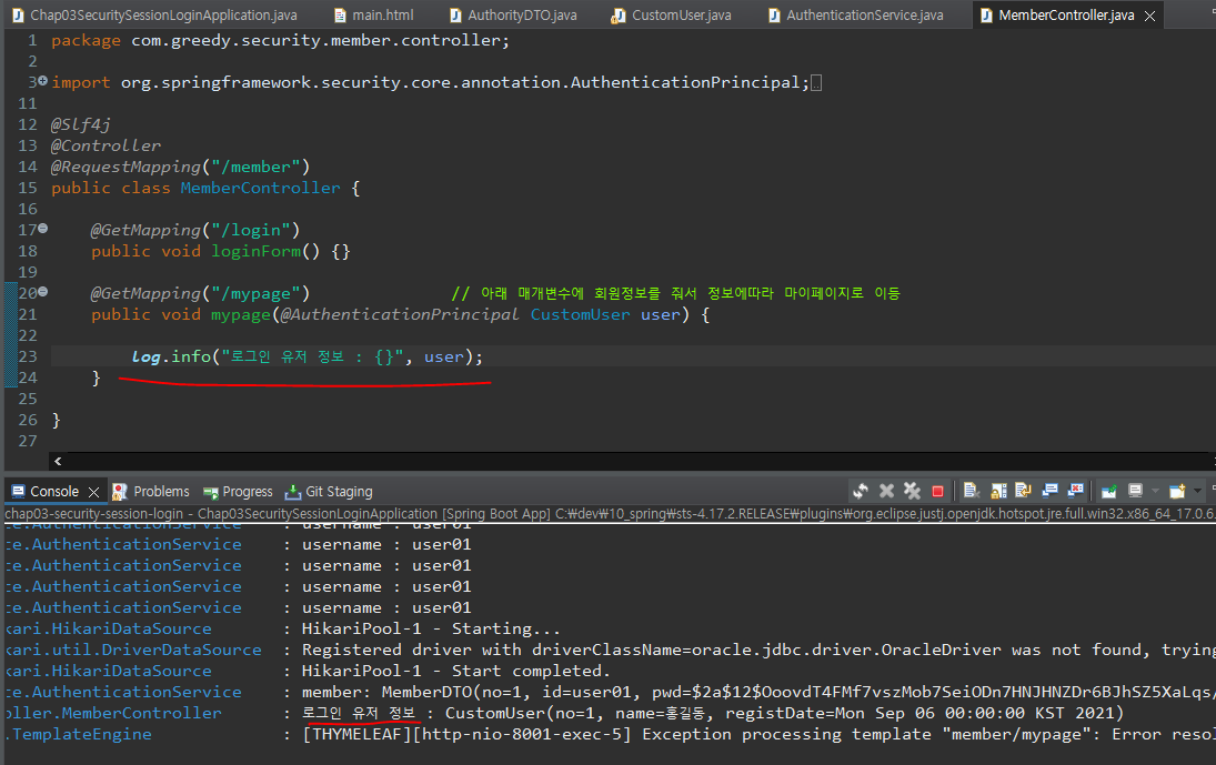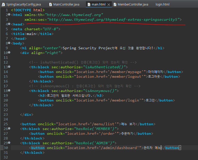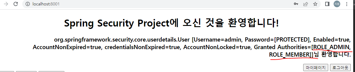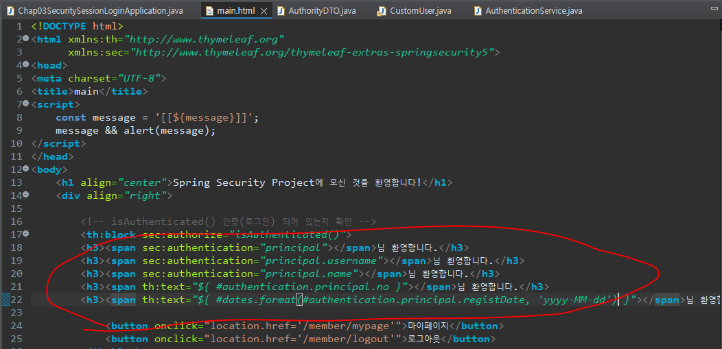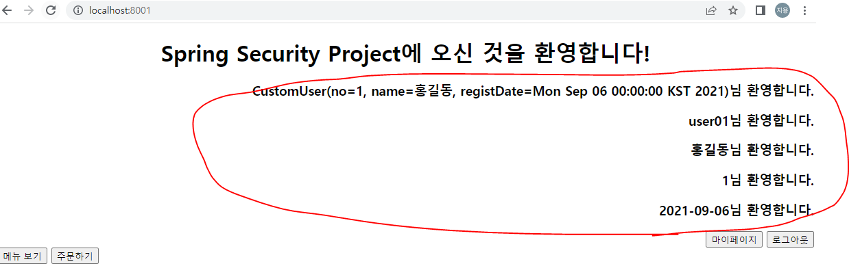 4번쨰5번째는 타임리프 문법이여서 어덴티케이션을 붙여줘야 값이 나오고 밑에도 마찬가지이다. 유저로 로그인
