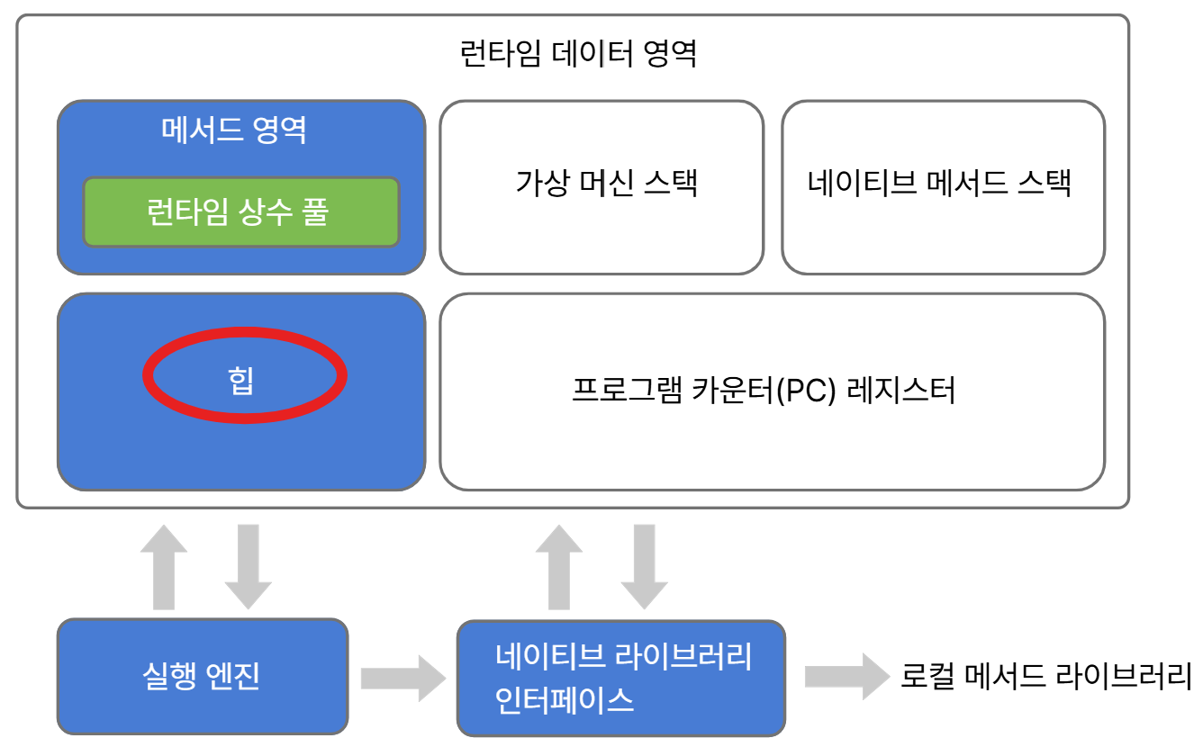 우리가 JVM를 실행하게 되면 주어진 RAM메모리를 역할에 맞게 적절히 나누어 사용하게 되는데 이 것을 런타임 데이터 영역이라고 한다. 그리고 아래 사진 중에 주로 힙이 GC의 대상이 된다. 자바 힙은 자바 애플리케이션이 사용할 수 있는 가장 큰 메모리로 자바의 거의 모든 객체 인스턴스와 배열이 힙에 할당된다.
