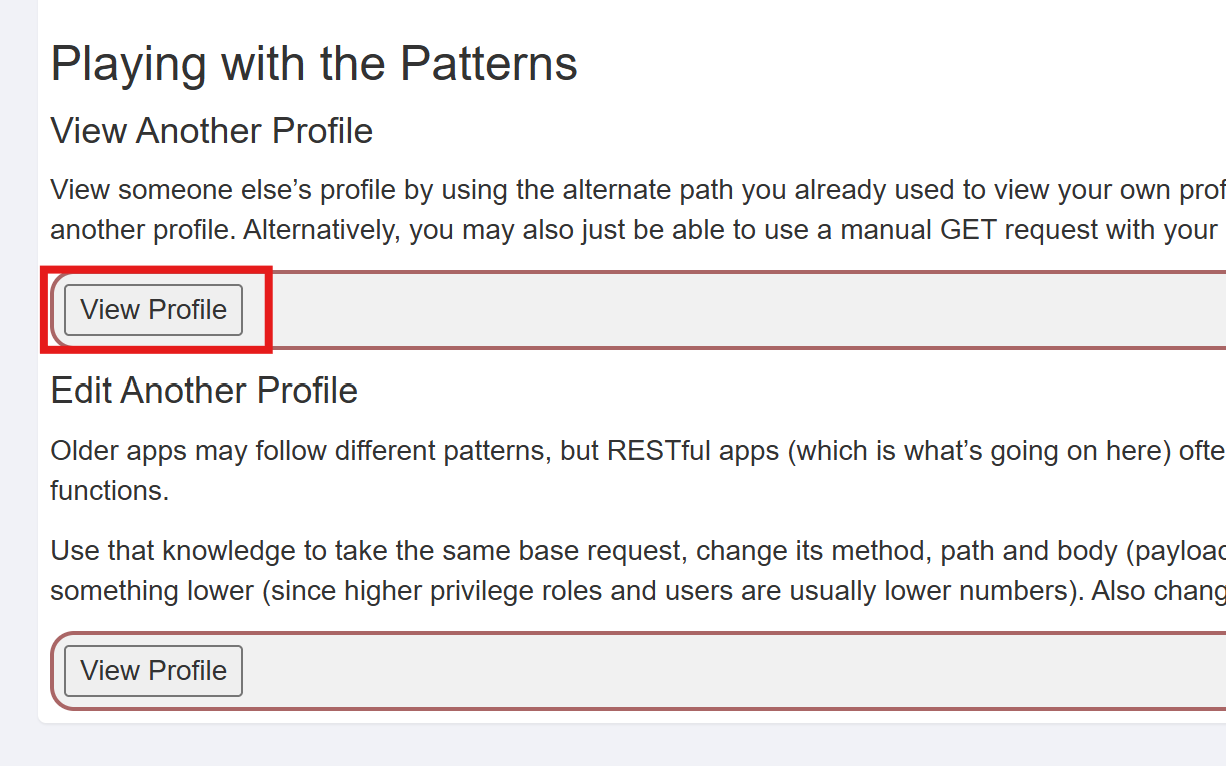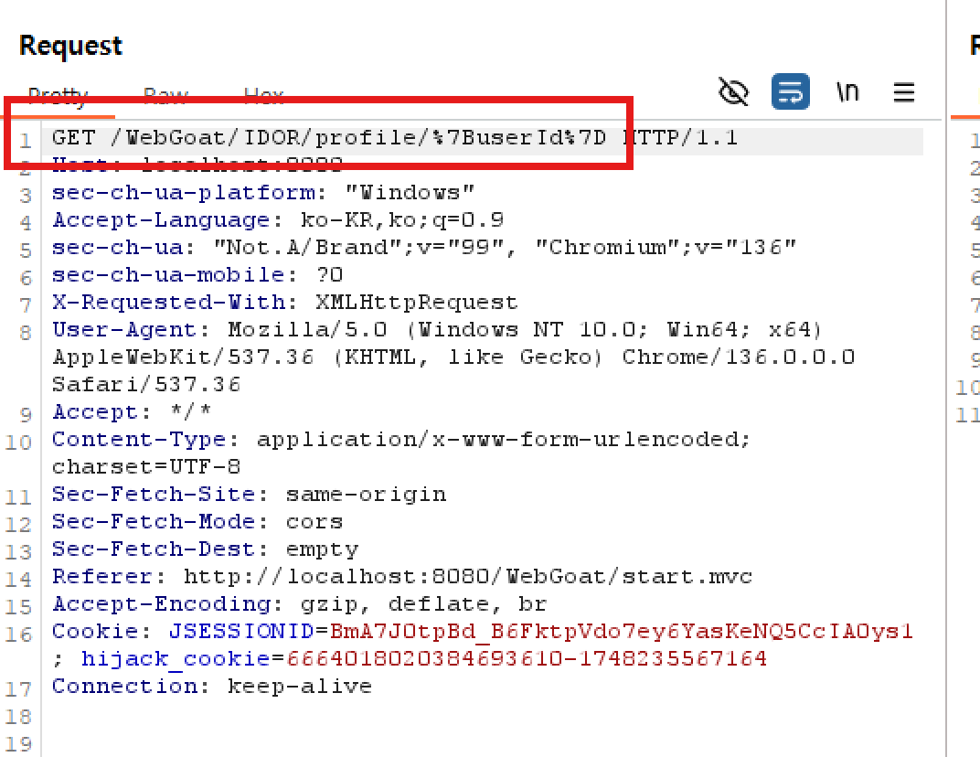 그럼 우리가 이전 단계에서 확인했던 DOR 했던 uri를 살펴보면 다음과 같이 View Profile를 누르고 request를 확인해보면 /WebGoat/IDOR/profile/%7BuserId%7D 인것을 확인할 수 있고 여기에 %7BuserId%7D에는 userId가 들어간다는 것을 추론할 수 있다.