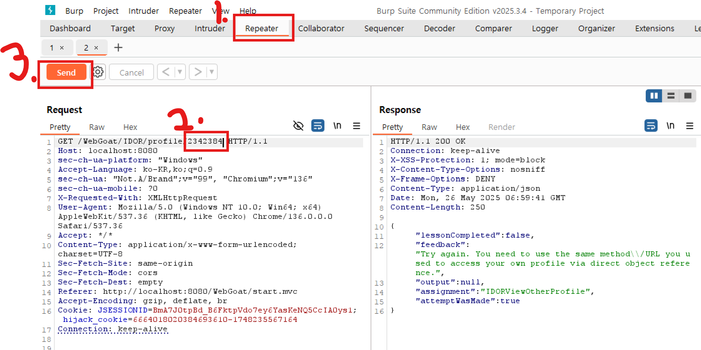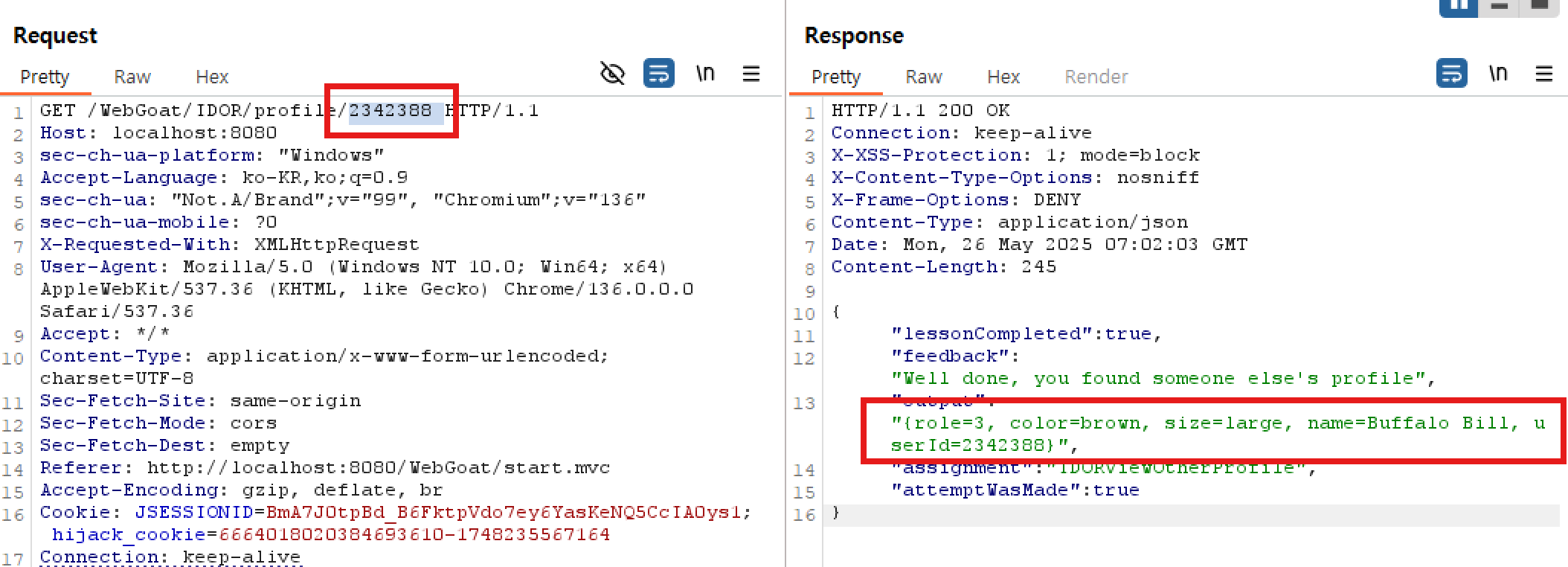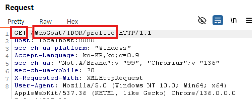 따라서 이전에 정보를 조회하는 uri를 봤을 때 GET과 /WebGoat/IDOR/profile에서 뒤에 path parameter 이나 query string으로 요청을 보내보면 좋을 것 같다.