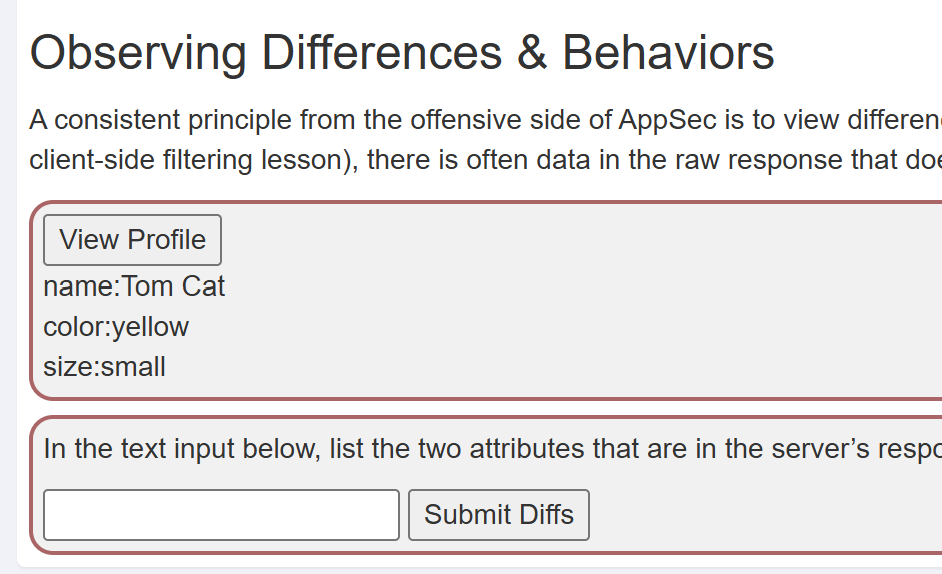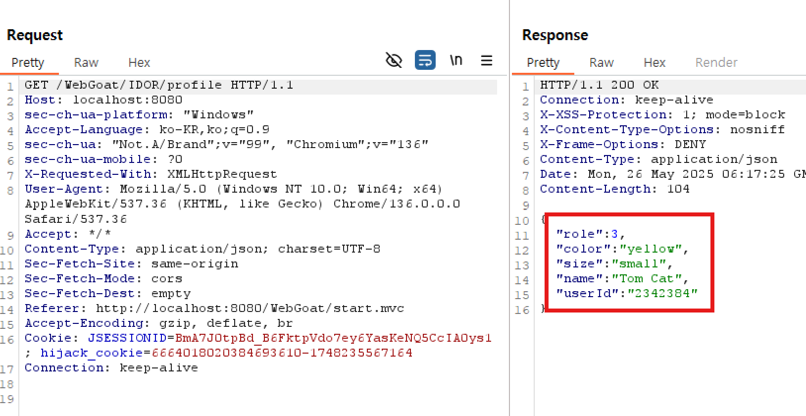 View Profile를 눌렀을땐 name, color, size의 정보가 나오지만, Brub Suite를 통해 response를 보면 위 정보 뿐 아니라 role, userId의 숨겨진 정보가 있는 것을 확인할 수 있다.