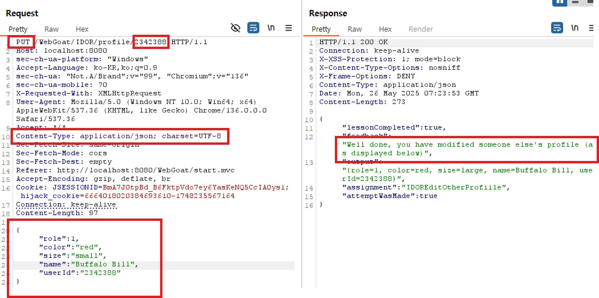 WebGoat에서 사용자의 권한은 기존보다 낫게, color은 red로 변경하라고 했고, 우리는 PUT이라는 HTTP method를 통해 정보를 수정해보자.