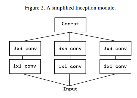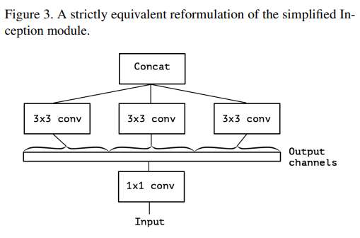 우리는 Inception 모듈을 컨볼루션 신경망에서 일반적인 컨볼루션과 depthwise separable convoulution 작업 사이의 중간 단계로 해석할 수 있음을 제시합니다.