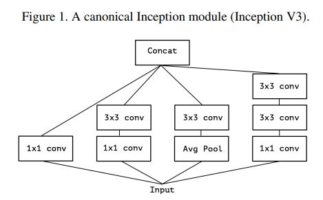 그림 1은 Inception V3 아키텍처에서 Inception 모듈의 표준 형태를 보여줍니다. Inception 모델은 이러한 모듈의 스택으로 이해될 수 있습니다. 이는 간단한 컨볼루션 레이어 스택으로 구성된 이전의 VGG 스타일 네트워크와는 다른 접근 방식입니다.