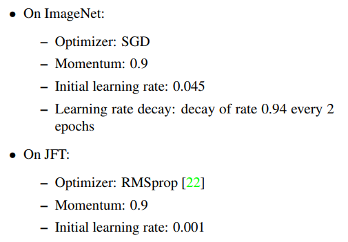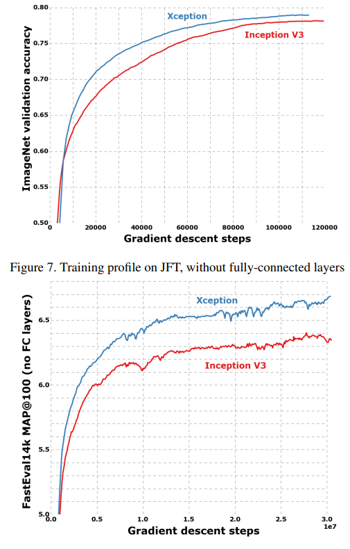 두 데이터셋 모두 Xception과 Inception V3에 대해 같은 최적화 구성이 사용되었습니다. 이 구성은 Inception V3의 성능을 최적화하기 위해 조정된 것으로, Xception에 대해 최적화 하이퍼파라미터를 조정하지 않았습니다. 네트워크들이 서로 다른 학습 프로파일을 가지고 있기 때문에(그림 6 참조), 특히 ImageNet 데이터셋에서는 이 최적화 구성이 최적이 아닐 수 있습니다. ImageNet 데이터셋의 경우, Inception V3에 맞추어 신중하게 조정된 최적화 구성을 사용했기 때문입니다.
