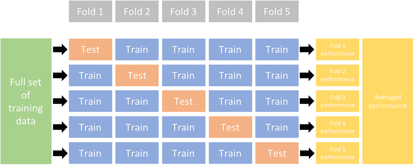 K-Fold Cross Validation은 데이터셋을 K개의 폴드(fold)로 나눈 후, 매번 다른 폴드를 검증 데이터로 사용하여 모델을 평가합니다. 예를 들어, K=5인 경우, 데이터셋을 5개의 폴드로 나눈 후, 각 폴드를 한 번씩 검증 데이터로 사용하며 나머지 4개의 폴드를 훈련 데이터로 사용합니다. 이 과정을 통해 최적의 성능을 내는 모델을 찾은 후, 마지막으로 테스트 데이터로 평가를 진행합니다.