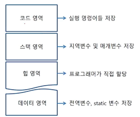 - 메모리에는 코드 영역, 스택 영역, 힙 영역, 데이터 영역 총 4가지로 구분