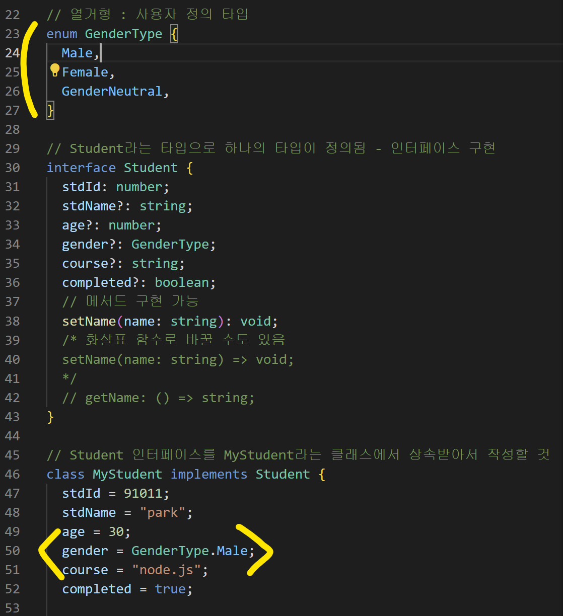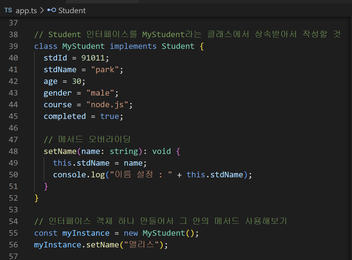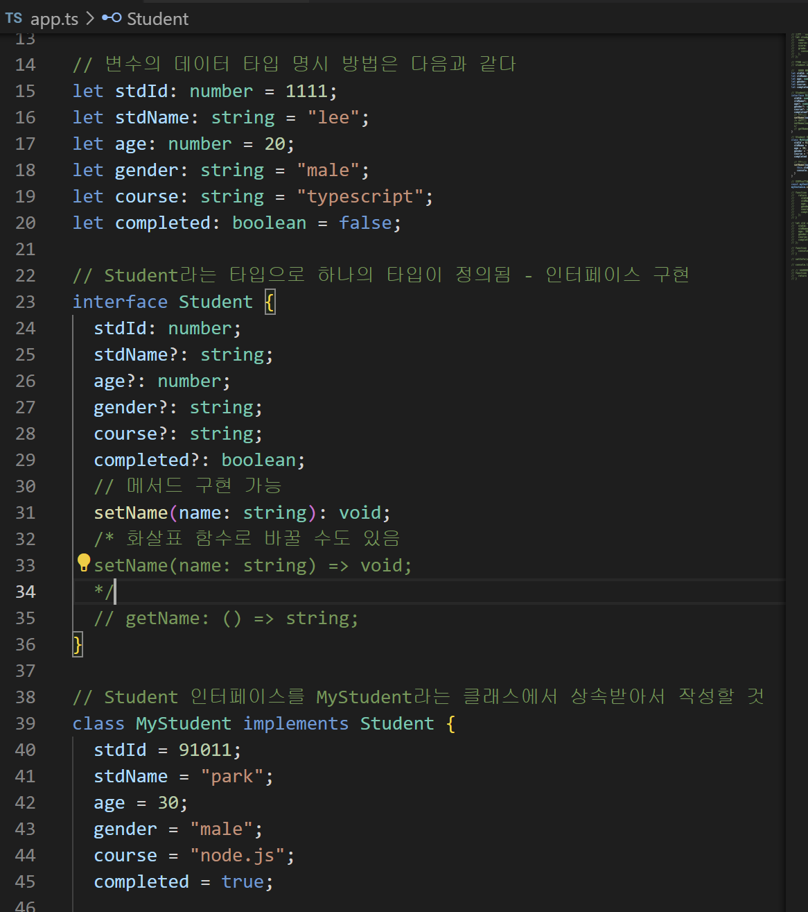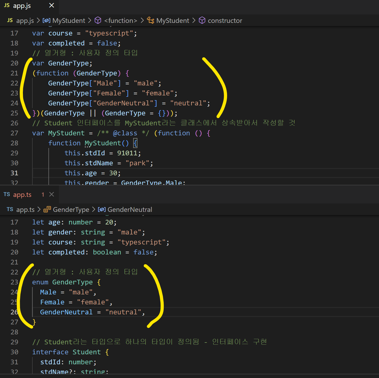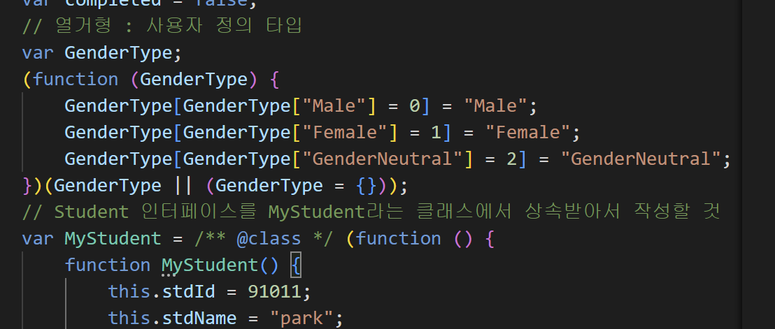 짚고 가야 할 것 : app.ts에는 작성한 인터페이스가 보이지만 app.js에는 인터페이스가 보이지 않는다. 이유? 완벽하게 구현되지 않은 타입이므로 굳이.. 보여주지 않음