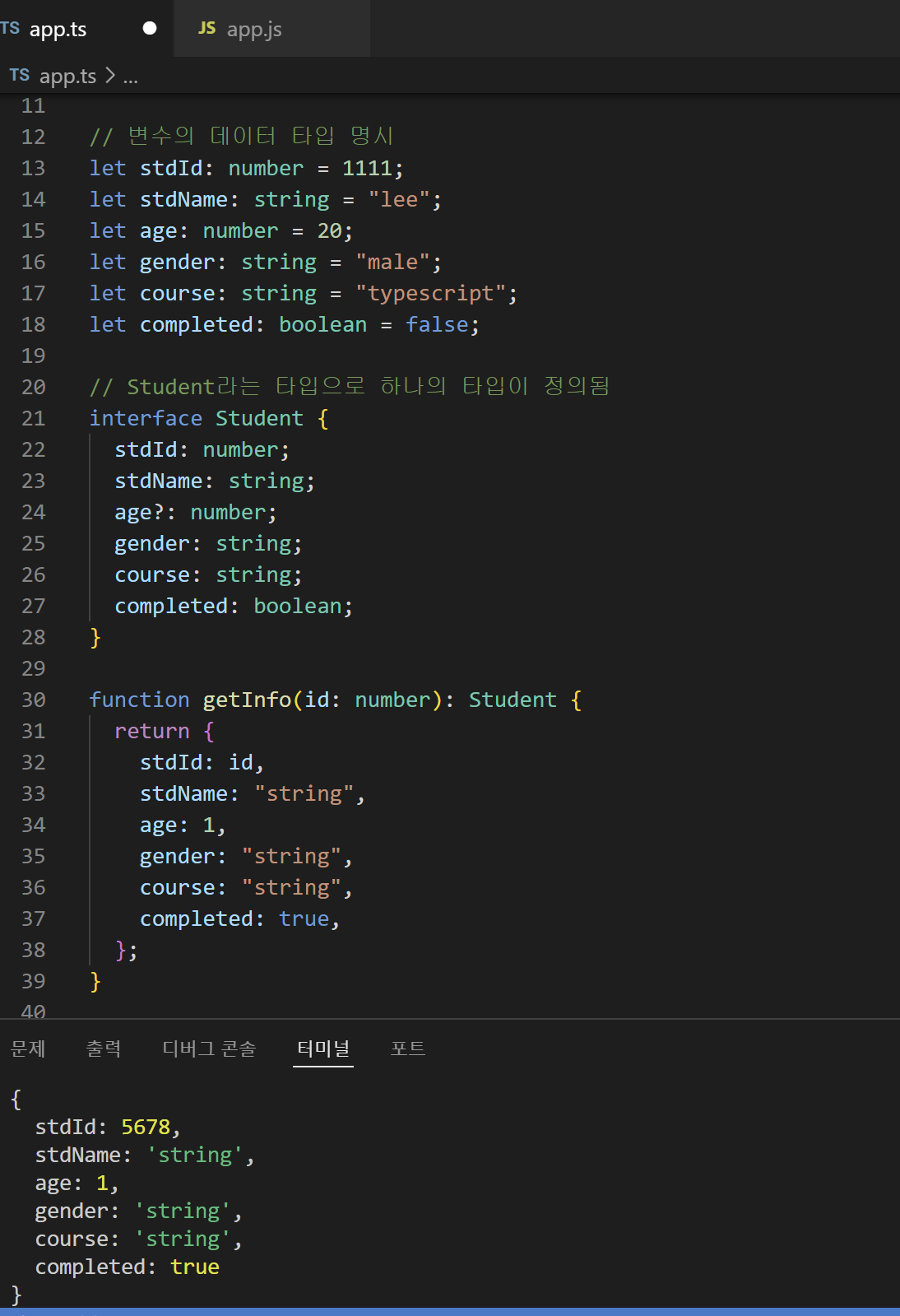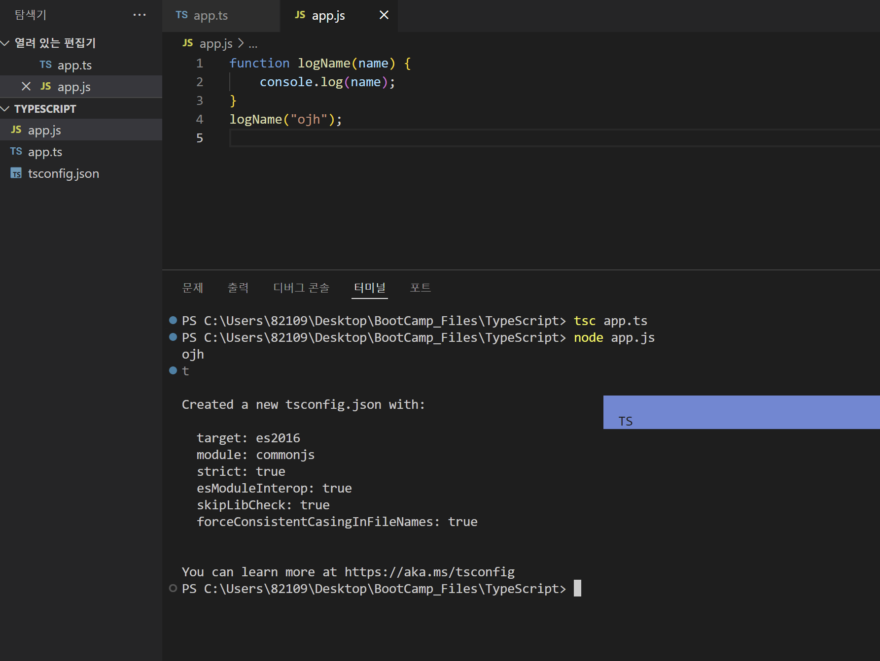 app.ts 작성, 터미널에 tsc app.ts하여 컴파일한 결과인 app.js 파일이 새로 생긴 것을 확인, 터미널에서 node app.js하면 작성한 app.ts의 결과값을 app.js파일을 통해 확인할 수 있다.