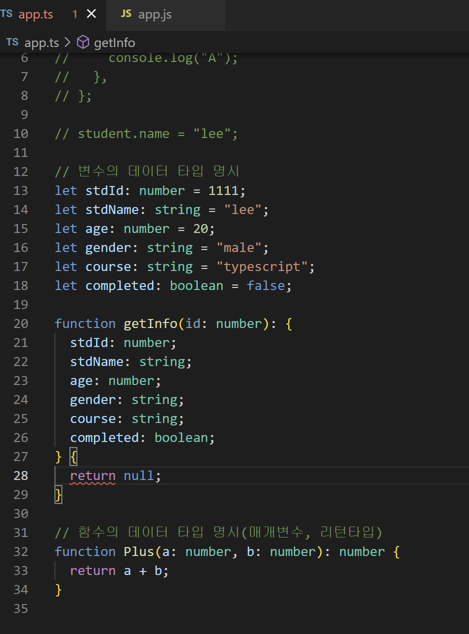 만약 return에서 age: 1을 주석처리 해보면, return타입에맞지 않는다는 오류가 뜨게 됨. Student 데이터타입에 맞는 반환값이 아니라는 뜻으로 오류가 뜸.