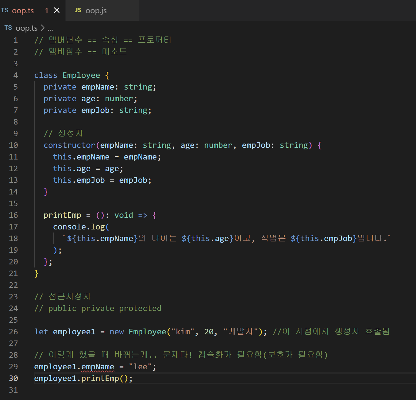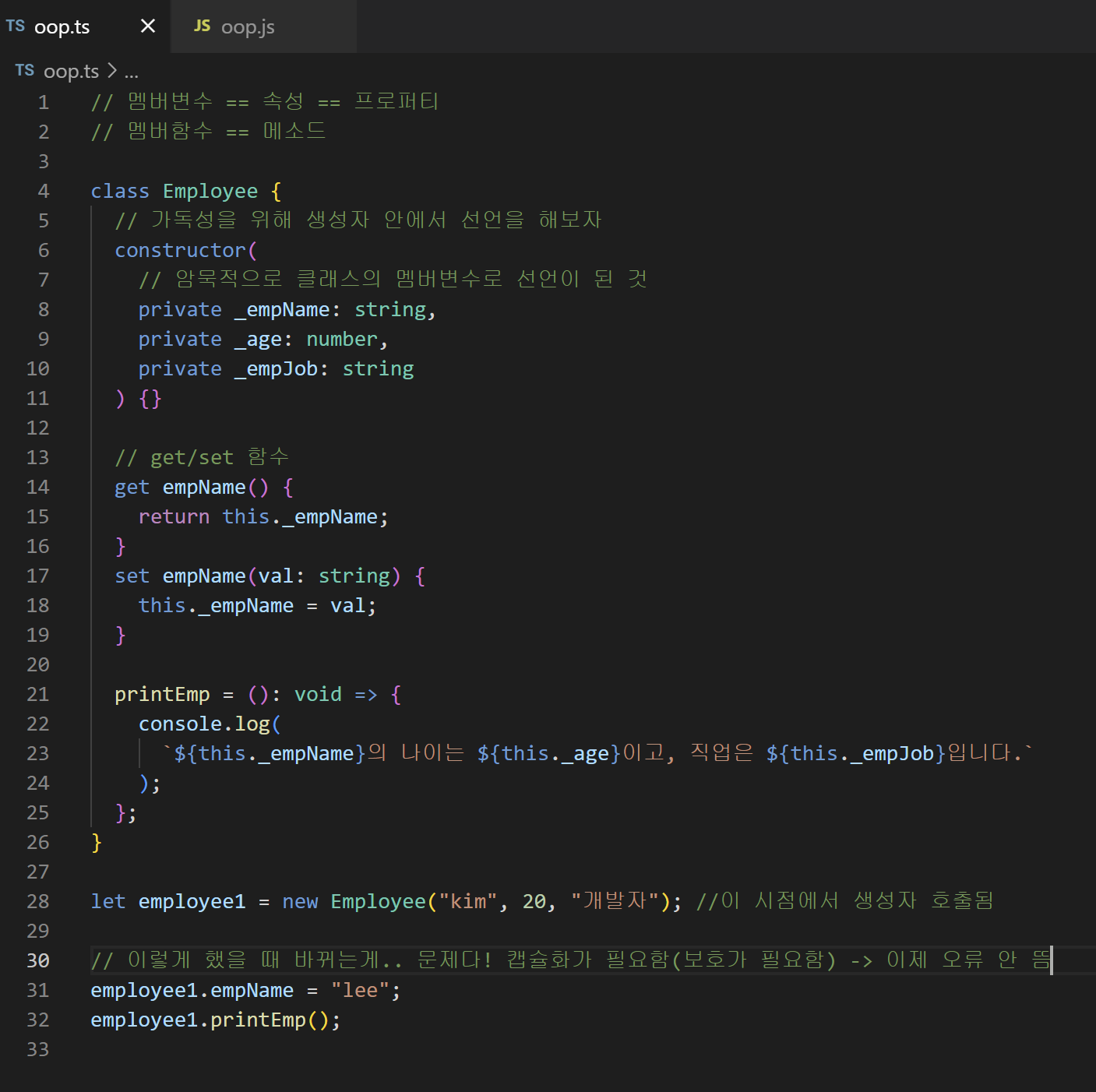 private으로 선언된 멤버변수에 접근할 수 있도록 ts에서 제공하는 getter와 setter 메서드.