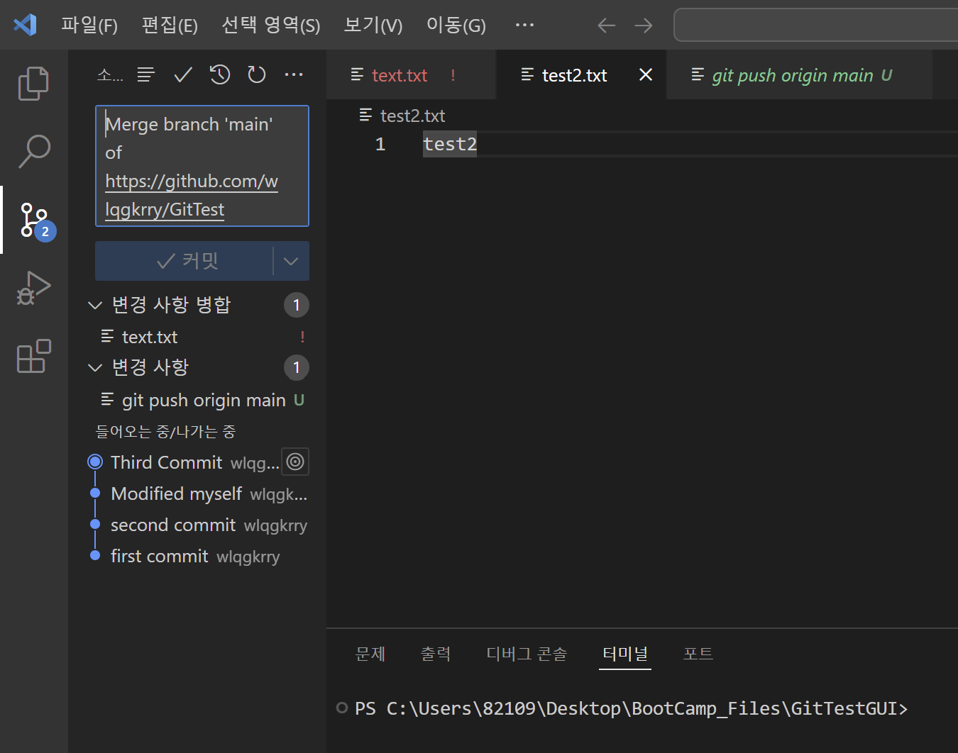 로컬에 레포지토리(GitTestGUI) 만들기!