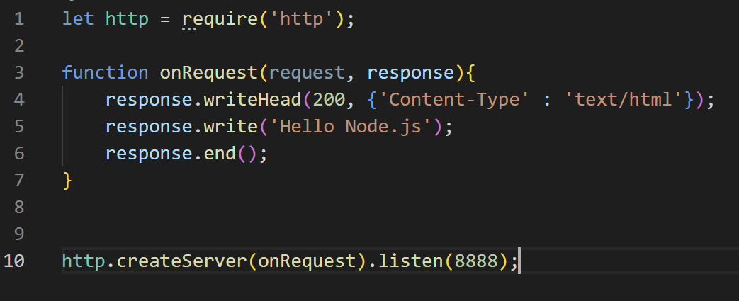 -> http 모듈을 통해 서버를 만들었는데 onRequest함수로 통신을 할 것이고, 클라이언트와 이야기할 때에는 8888이라는 주파수로 맞출 것이다.