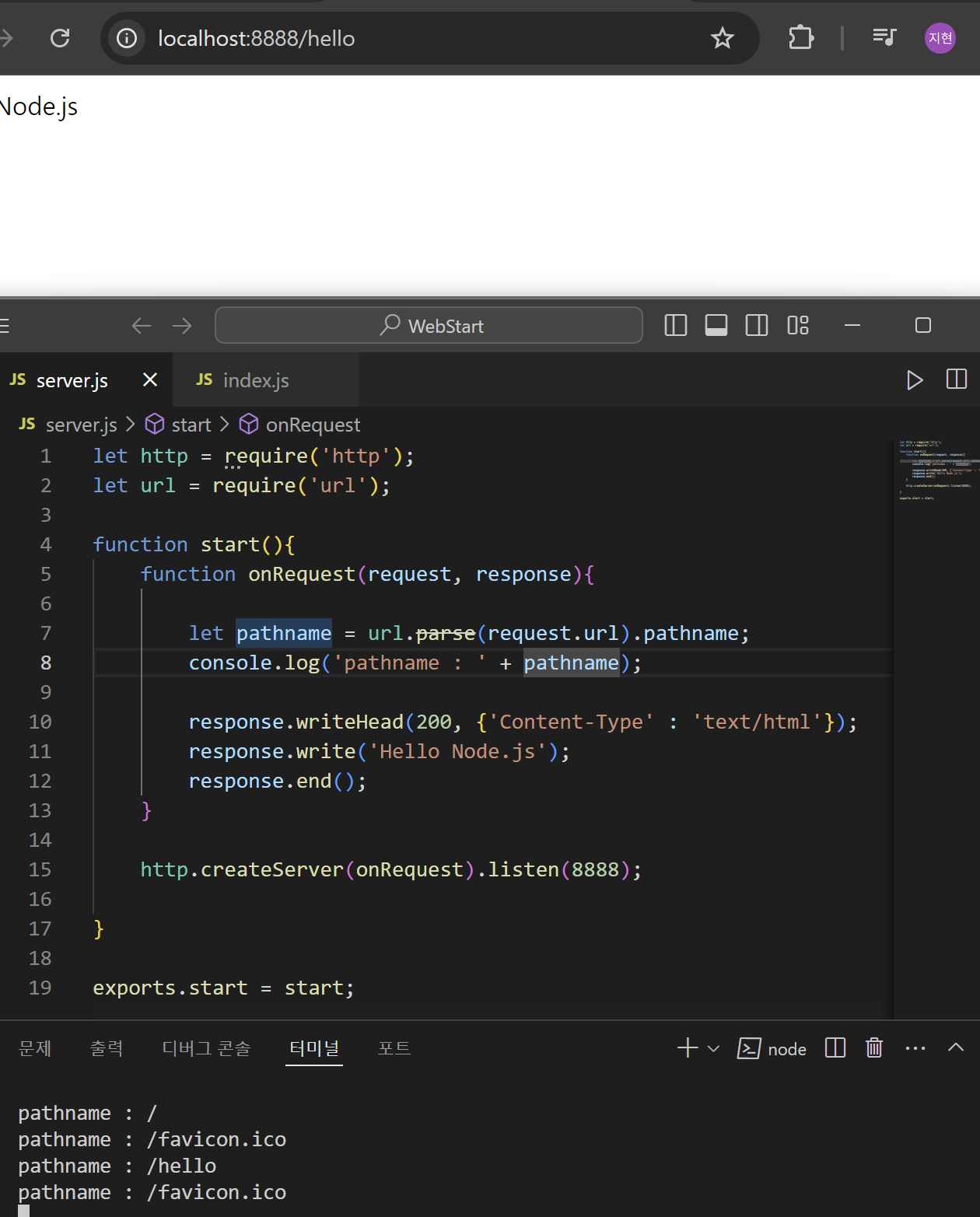 console.log를 통해 콘솔에 pathname을 찍어보면, pathname은 8888뒤에 나오는 경로를 뜻함을 알 수 있다.