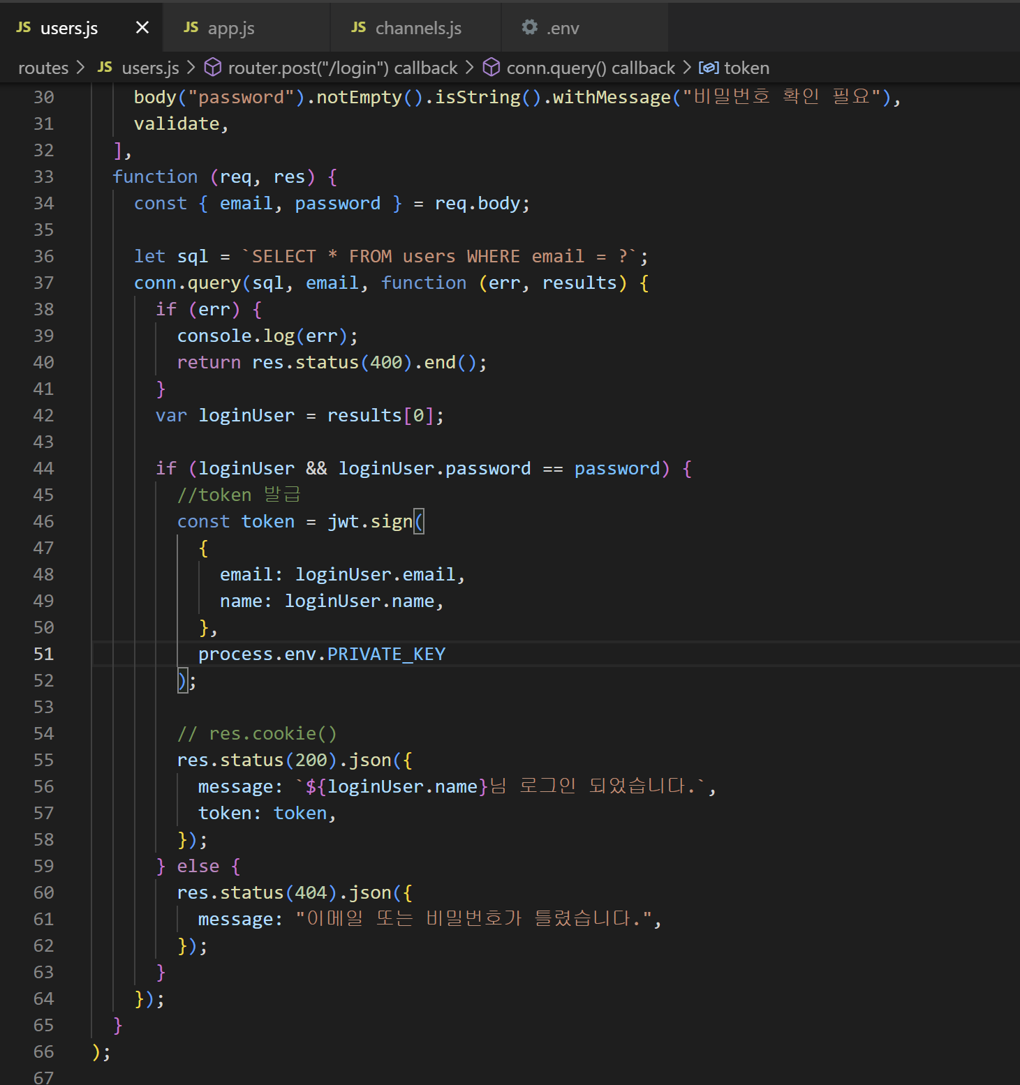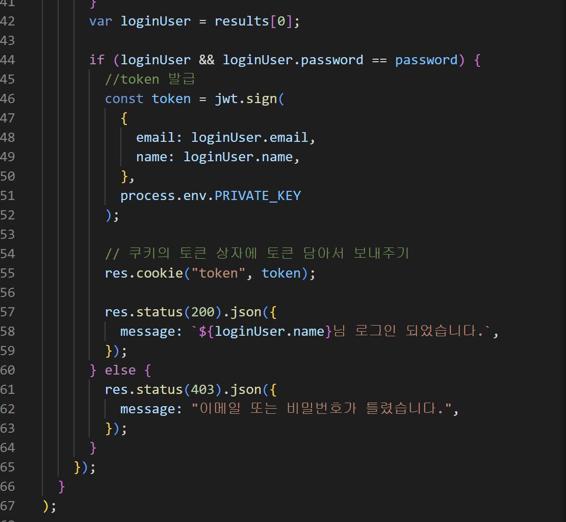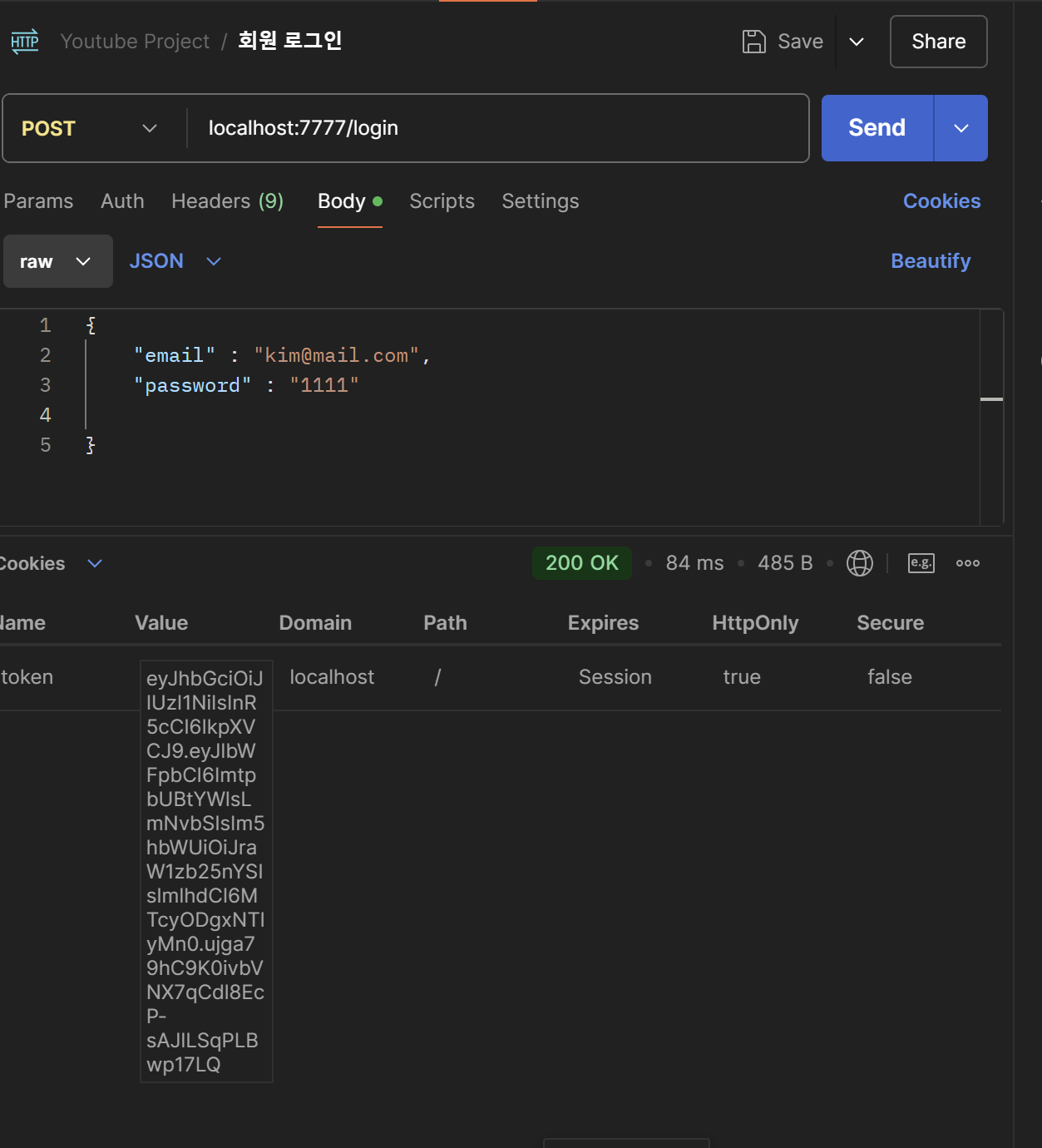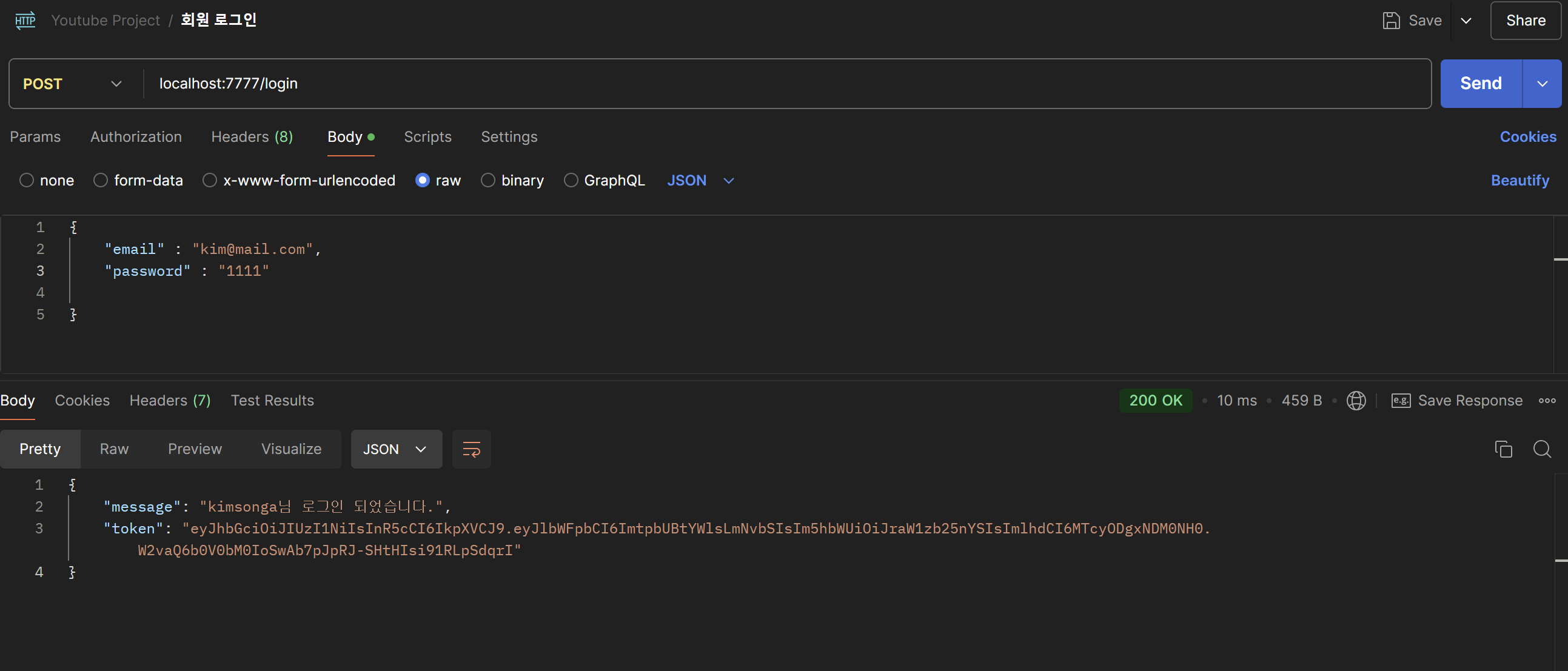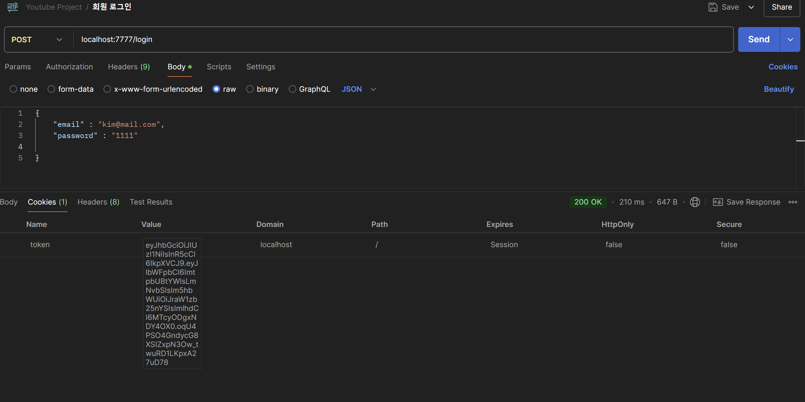 body값에서 보내는 res.json({token : "token";}); 줄 삭제,