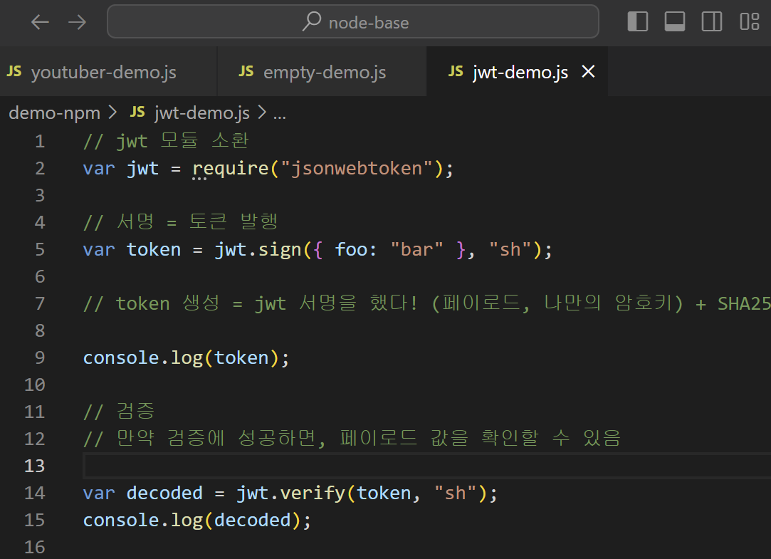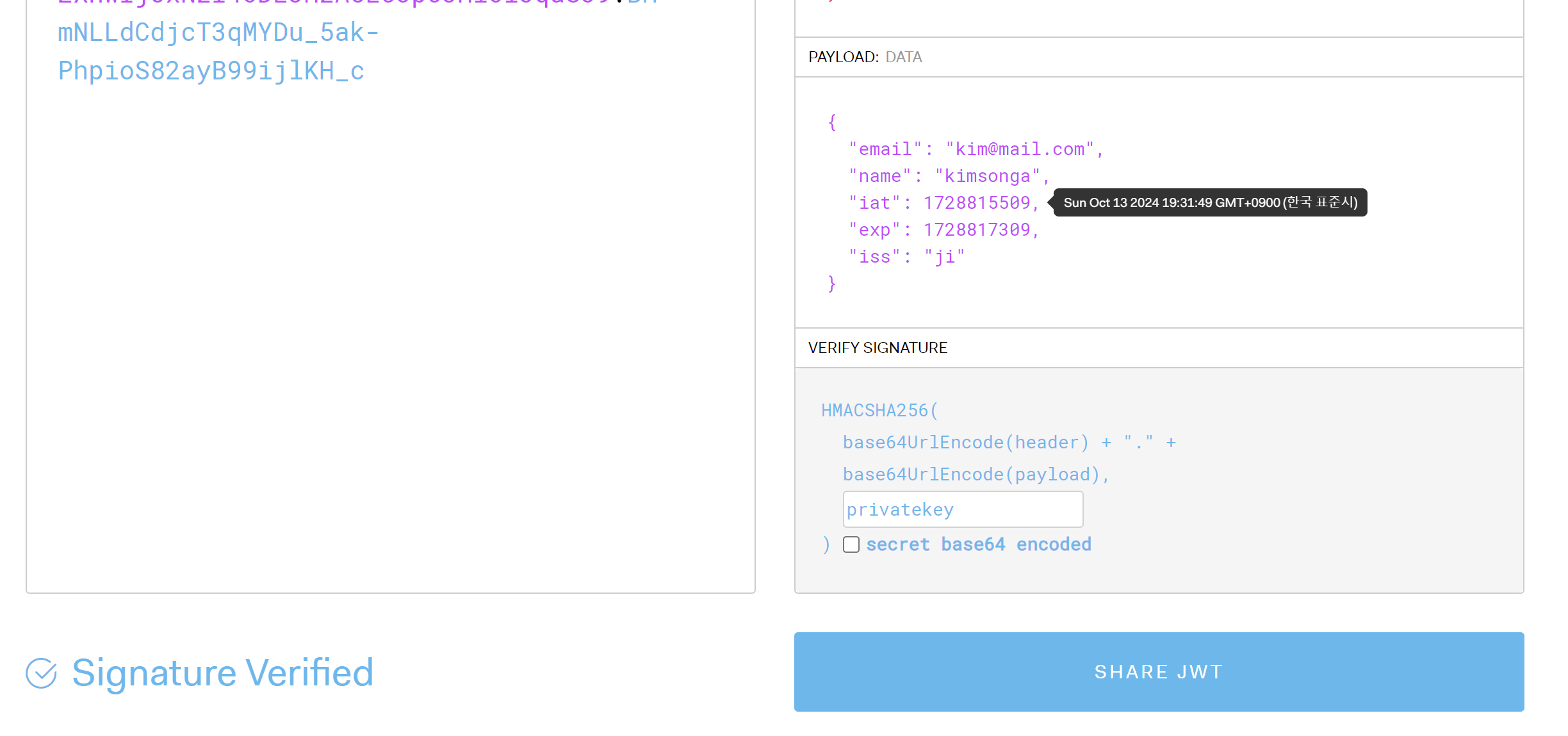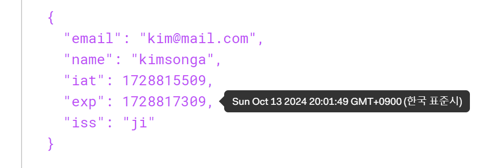 iat : 토큰이 생성된 시간. 따라서 같은 내용으로 토큰 생성을 해도 생성시간이 바뀌므로 토큰의 글자는 바뀌게 된다.