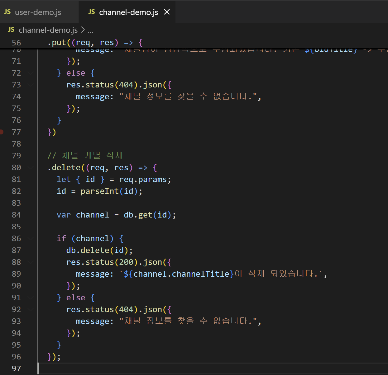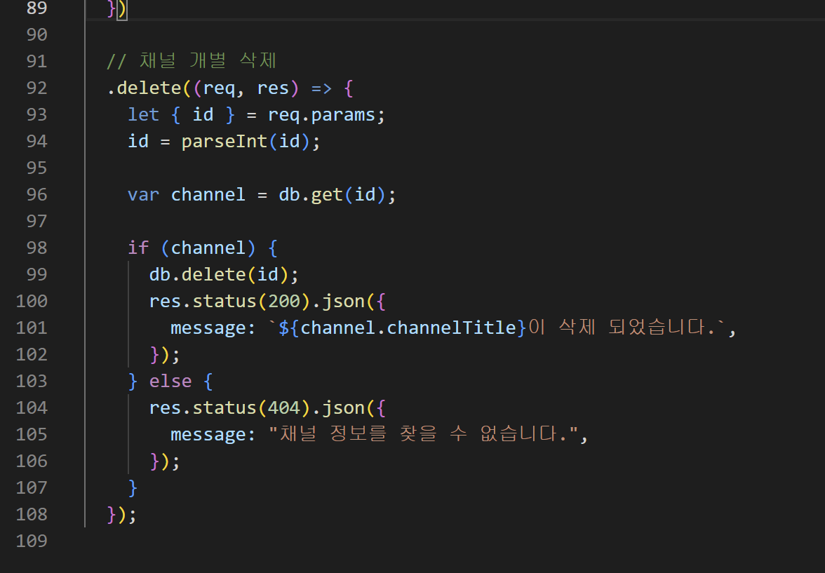 (2) 삭제 버튼 클릭 시 => 개별 채널 삭제 API
