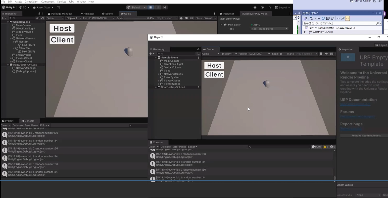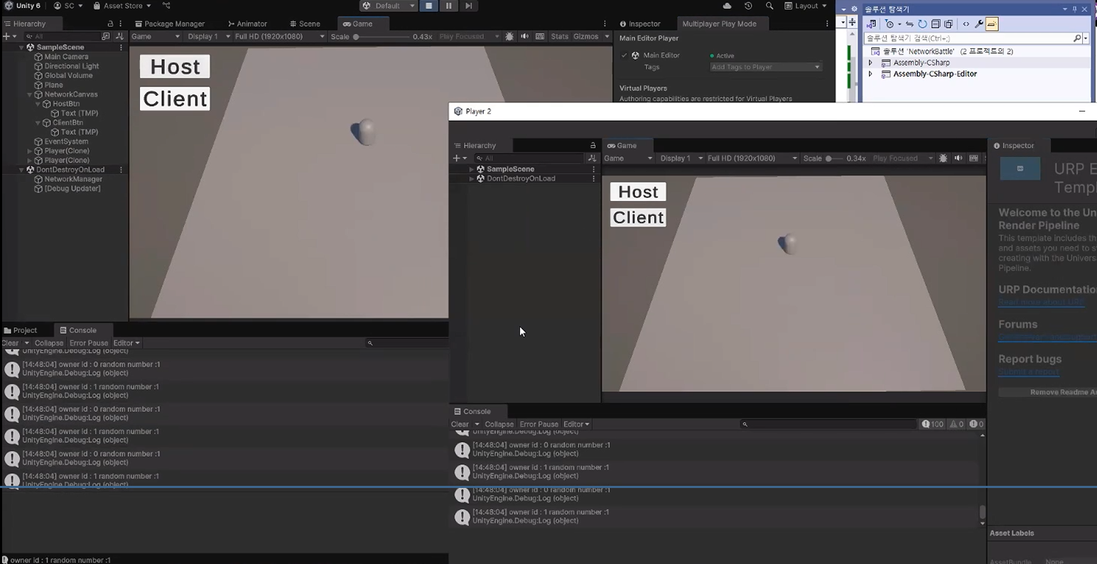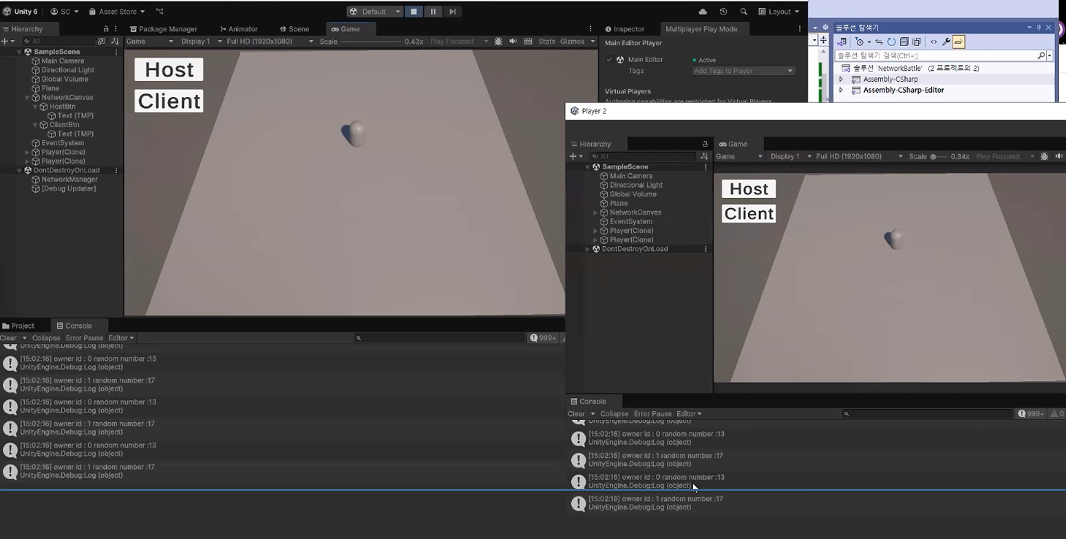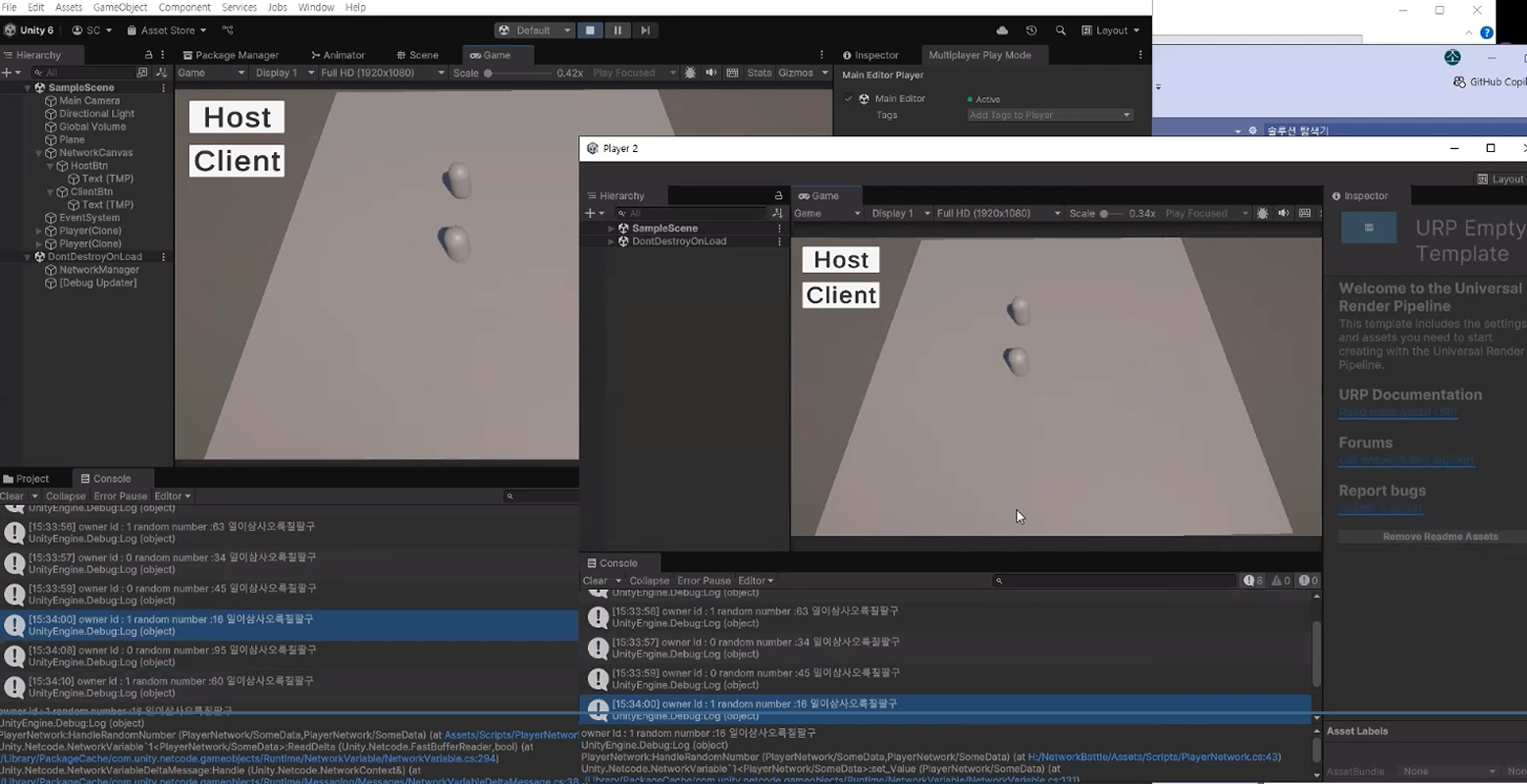 위 사진은 Host에서 T를 누른 상태인데, Host의 randomNumber가 99로 바뀌었다. Client의 randomNumber는 그대로 1이다. 왜냐하면 Host에서 T를 눌렀기 때문