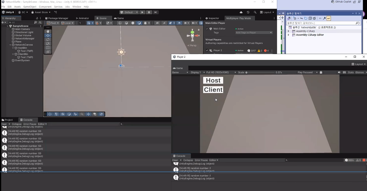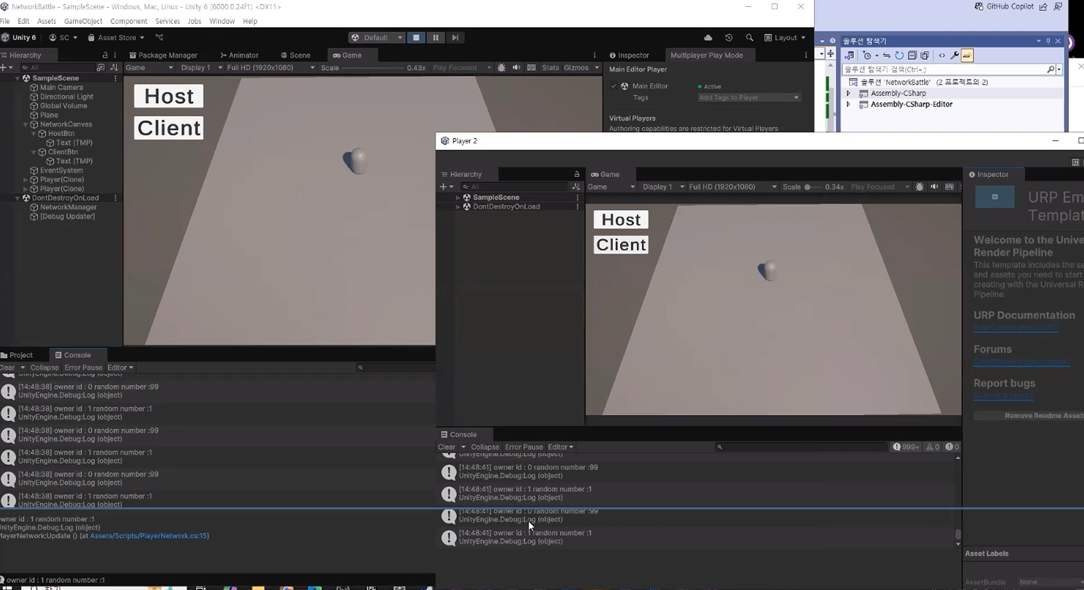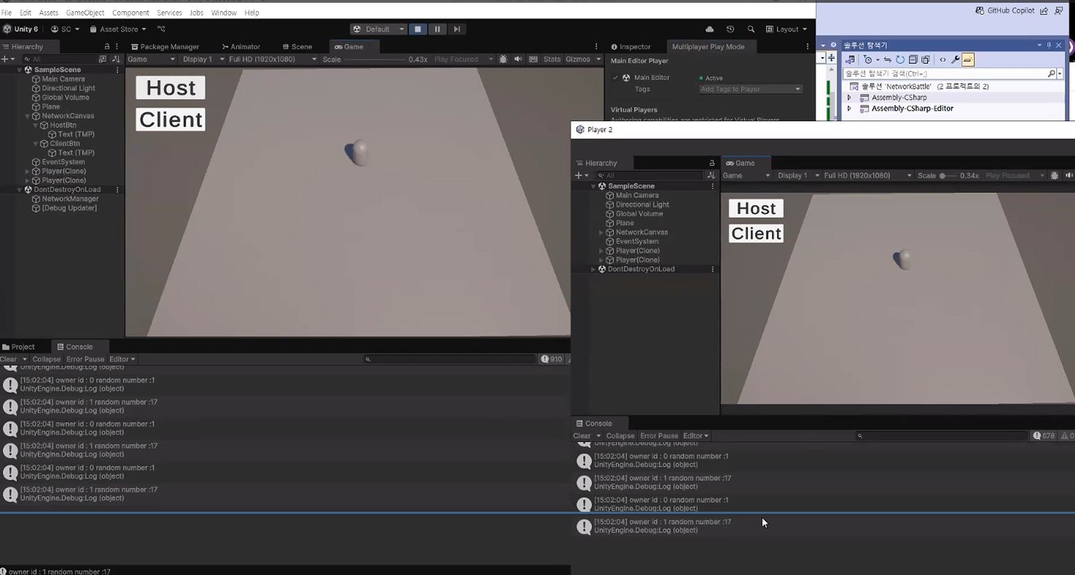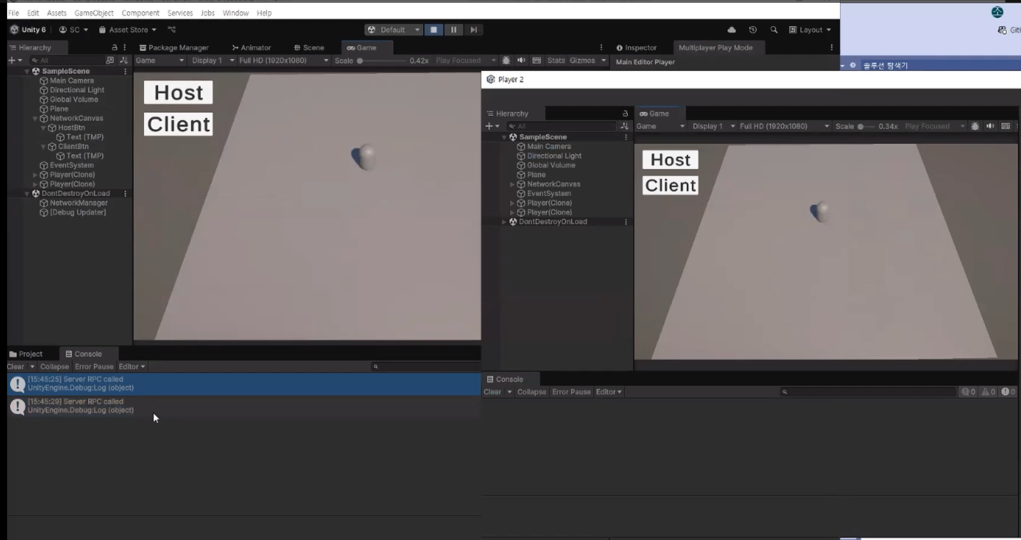위 사진은 Host에서 T를 누른 상태인데, Host의 randomNumber가 99로 바뀌었다. Client의 randomNumber는 그대로 1이다. 왜냐하면 Host에서 T를 눌렀기 때문