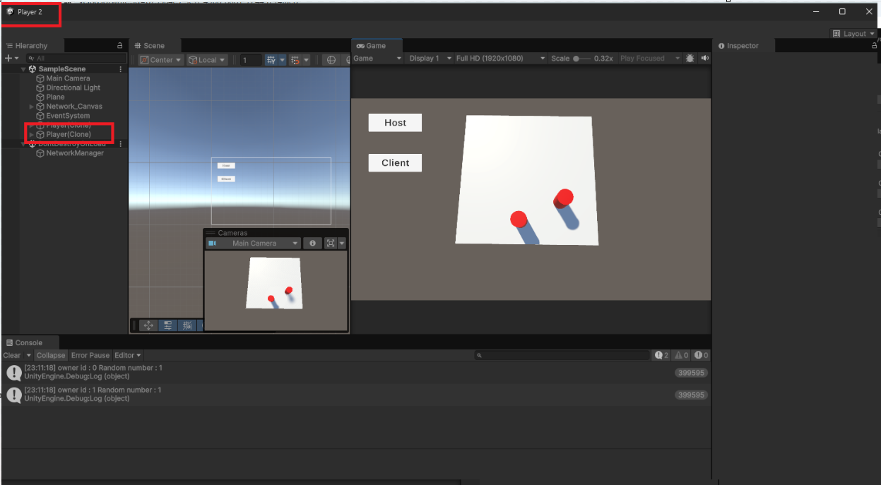 위 사진은 T를 누르지 않은 상태이다. 즉, 초기 사진이다. 각각의 다른 OwnerId가 출력되었고, randomNumber는 1로 동일하다. Host -> OwnerId는 0 , Client -> OwnerId는 1이다.