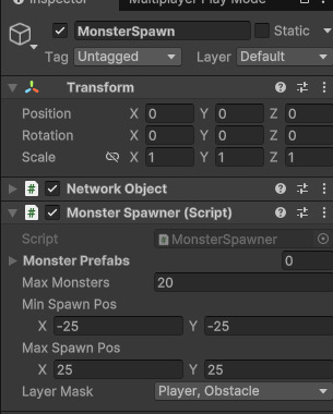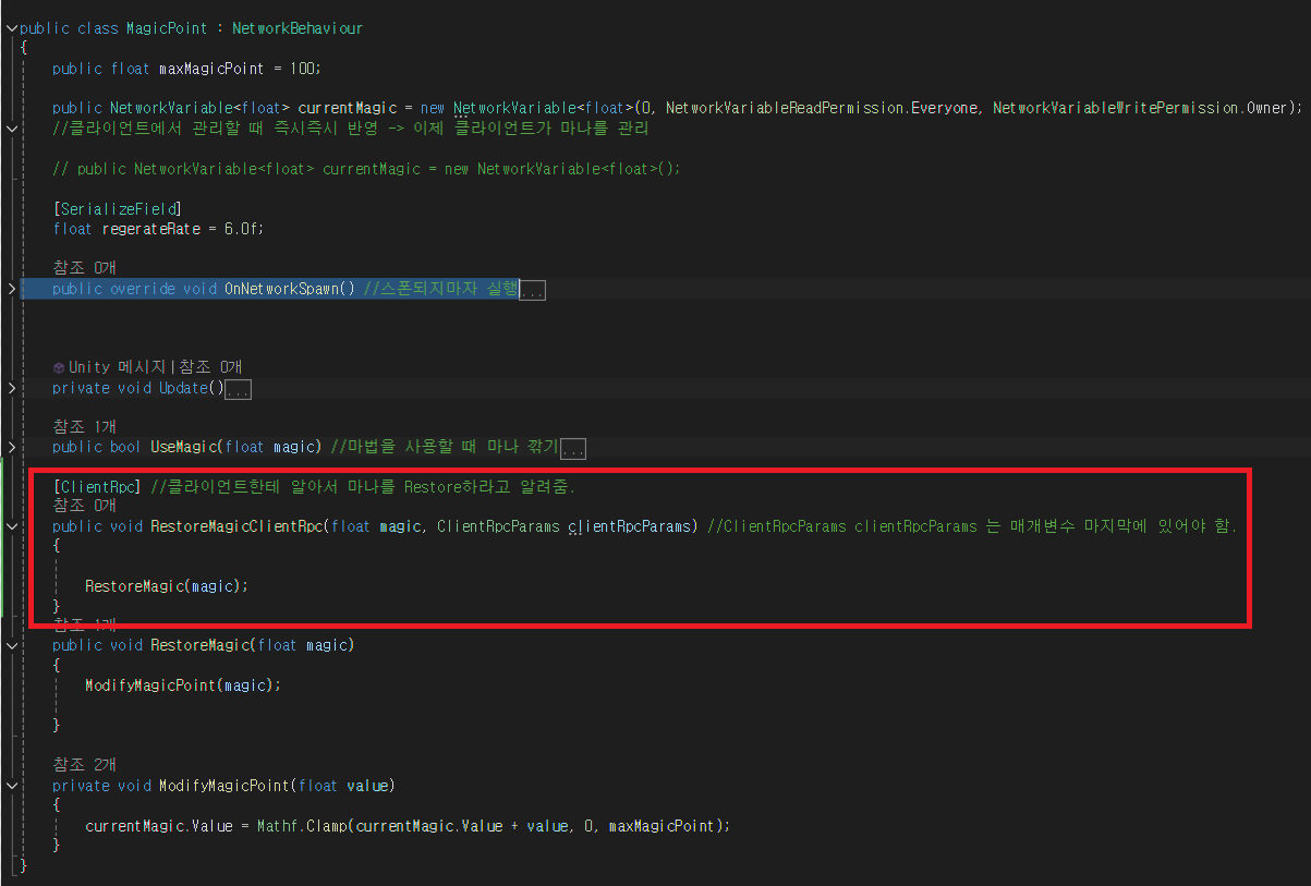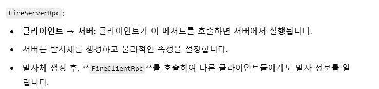 [ServerRpc] //서버에서 실행. 함수 이름 = 함수 이름 + ServerRpc 로 끝나야 함.