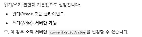 NetworkVariableReadPermission.Everyone, // 모든 대상자가 읽을 수 있는 권한