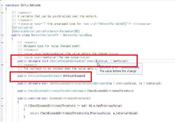 OnValueChanged 는 델리게이트이며, 매개변수 목록은 이전 값과 새로운 값이 필요하다.