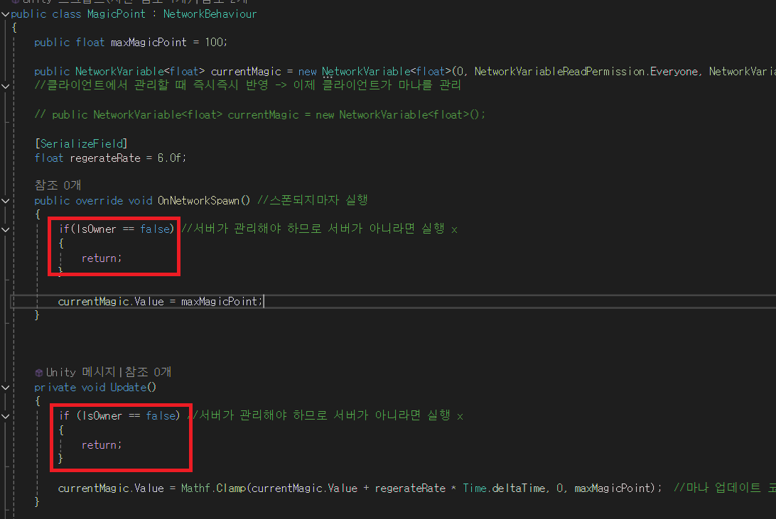 if (!IsOwner) { return; } // 해당 오브젝트의 Network Owner가 아니면 작동X