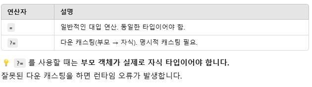 즉, 부모 클래스 타입의 객체를 자식 클래스 타입의 참조 변수에 할당할 때 사용