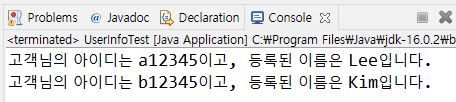 package ch07; public class UserInfoTest { public static void main(String[] args) { UserInfo userLee = new UserInfo(); userLee.userId = "a12345"; userLee.userPassWord = "zxcvbn12345"; userLee.userName = "Lee"; userLee.phoneNumber = "01034556699"; userLee.userAddress = "Seoul, Korea"; System.out.println(userLee.showUserInfo()); UserInfo userKim = new UserInfo("b12345", "09876mnbvc", "Kim"); System.out.println(userKim.showUserInfo()); } }출력 결과