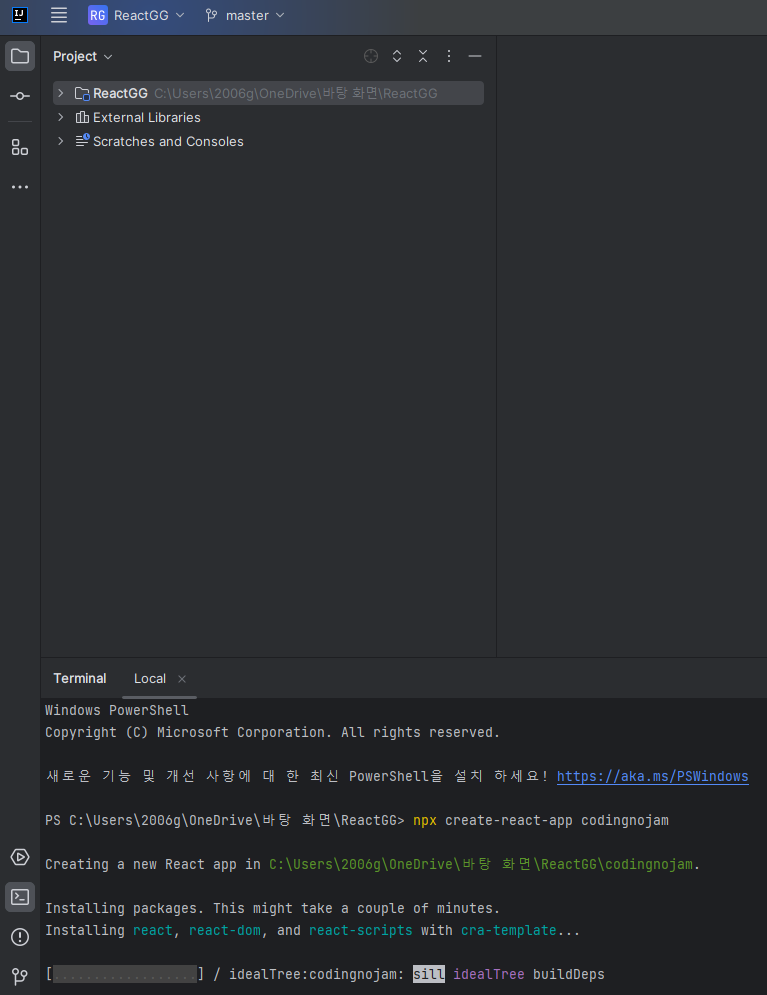 vscode든 인텔리제이든 터미널 창에서 아래에 "npx create-react-app" 폴더이름 을 쳐줍시다
