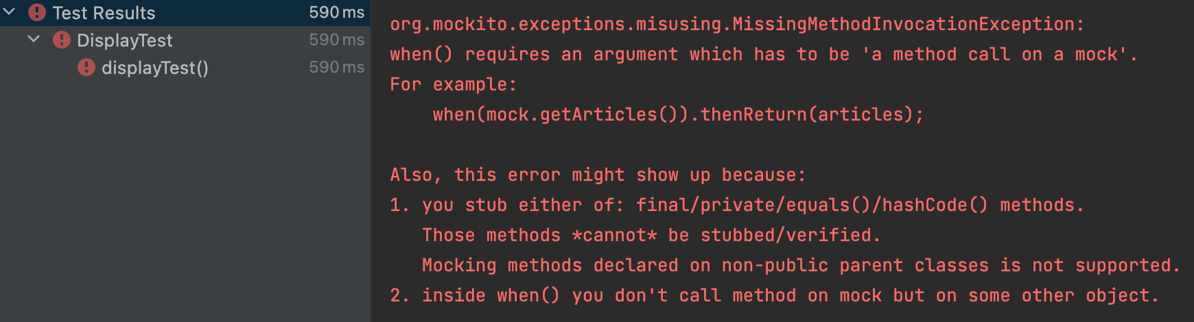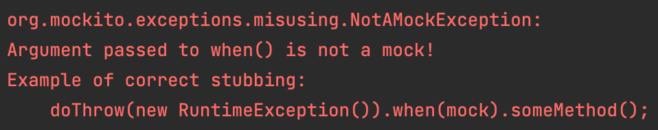 결과는 우리가 예상한 대로가 아닌 MissingMethodInvocationException이 발생합니다.