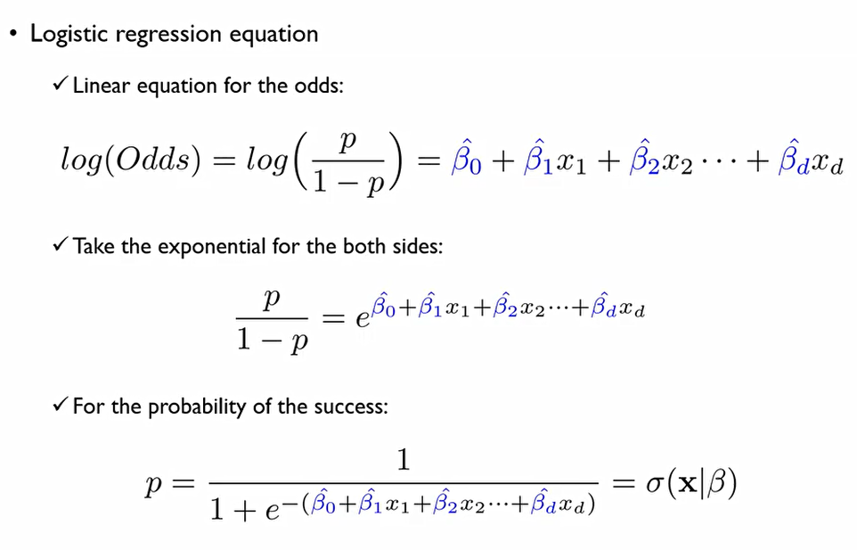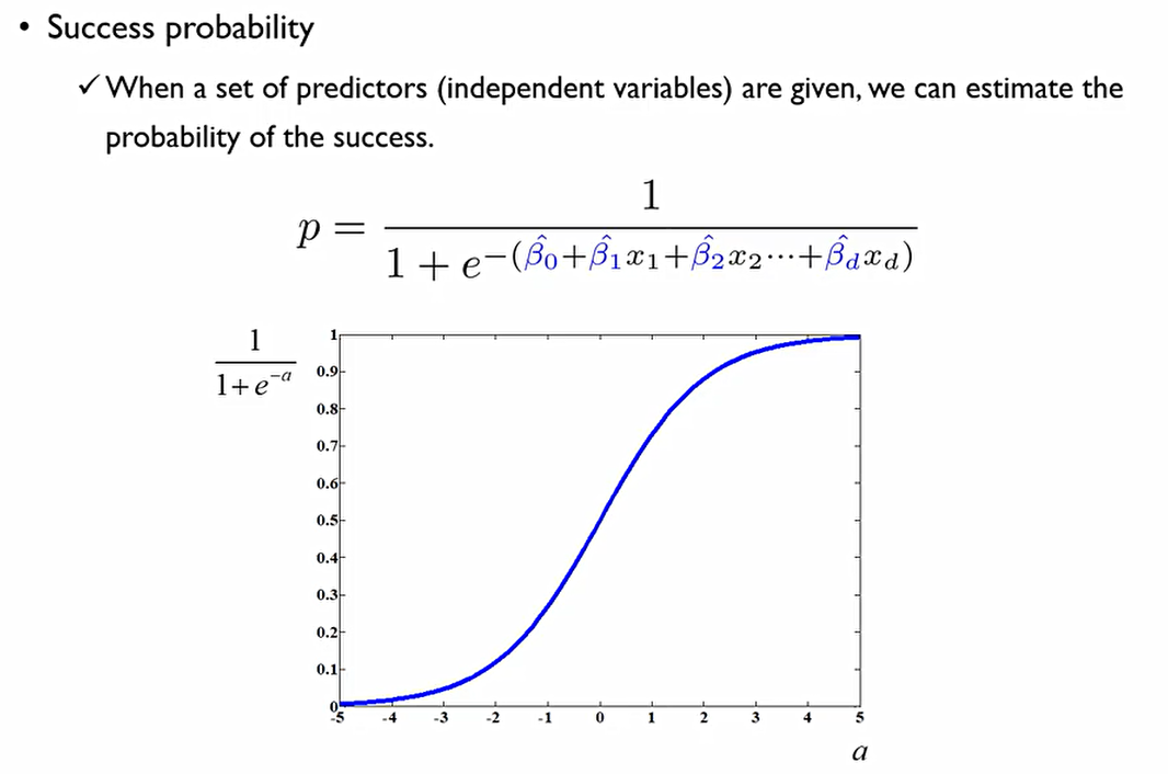 그러나 Logistic regression은 로그 승산을 계산하므로, 회귀식을 구성하는 β값들에 대한 해석이 어려워진다. 성공확률로 표현하면 아래와 같은 회귀식이 만들어지기 때문이다.