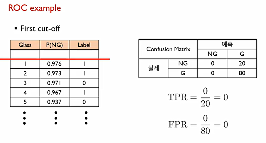 이때 True positive rate(TPR)은 0, False Positive Rate는 0이라는 값이 나온다.