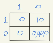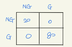 좋은 모델이라면, likelihood를 기준으로 나열한다면 첫번째부터 스무번째까지 모두 Label이 1이어야 최고의 결과물이 나온다. 이에 cut-off를 스무번째 P(NG)로 설정하면 다음과 같은 Confusion matrix가 나올 것이다.