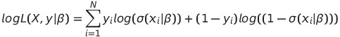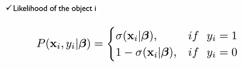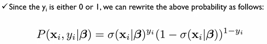 σ는 p(y=1)일 확률. β라는 어떠한 회귀계수가 추정되었다 치고, i번째 설명변수와 종속변수를 가지고 likelihood를 계산해보면 정답이 1에 속할 확률이면 위처럼 되어야 하고, 0에 속할 확률이면 아래처럼 되어야 한다.