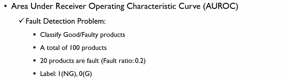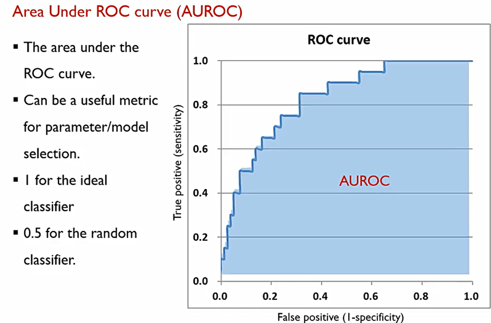 Area Under Receiver Operating Characteristic Curve(AUROC)는 이때 우리가 측정한 TPR과 FPR로 이루어지는 밑변의 넓이를 말한다. Ideal case일때 넓이가 1 이고, random classifier 경우에는 0.5이기에,
