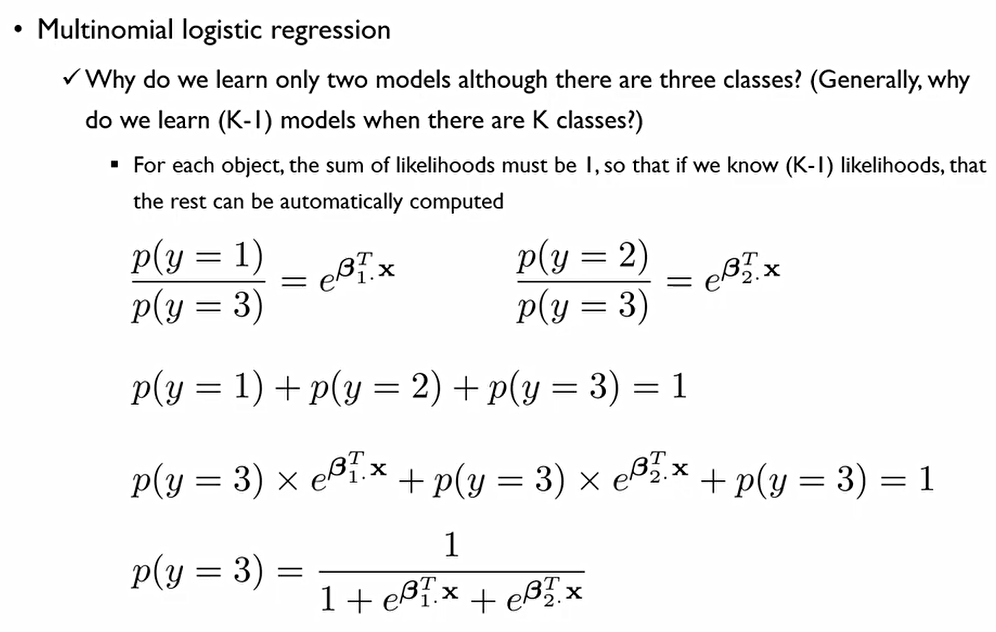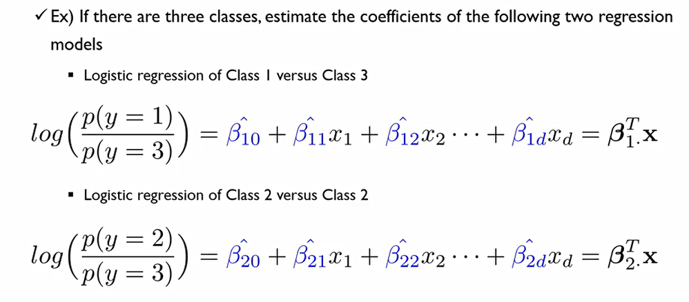 이때, 모든 Class들의 성공확률값을 더하면 1이 되어야 하는데, 이를 이용하여 나머지 한 개의 모델을 만들 수 있다.