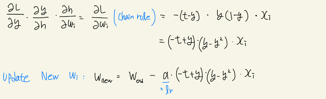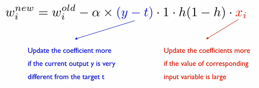 (y-t)는 y가 모형에 의해 추정된 값, t가 정답이였기에 둘 사이의 차이가 적으면 모형을 덜 움직이겠다는 것. 차이가 크면 많이 움직인다.