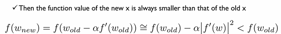 이 반대방향으로 정의해준 새로운 β^hat을 함수에 넣어주게 된다면 tylor expansion에 의해서 위처럼 나오게 된다. 즉, 다음과 같이 도함수의 반대방향으로 움직이게 된다면 항상 이전보다는 작아질 수 있다는 것을 보장해주게 된다.
