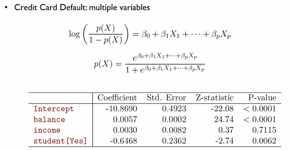 p-value에 관해서는 α는 0.05라고 가정한다면 유요한 변수는 balance와 student.