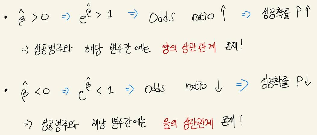input 변수가 1만큼 커졌을 때 성공에 대한 승산이 얼만큼 변화하느냐.