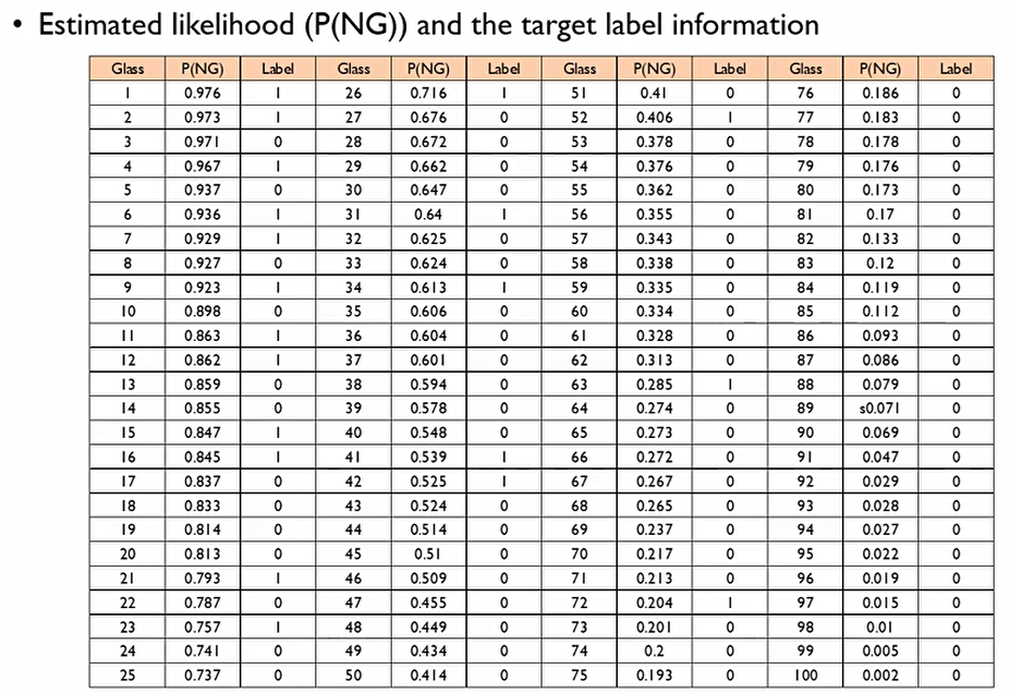 각각의 모든 Record를 우리가 원하는 범주에 대한 확률값(P(NG))에 대해 내림차순한다.