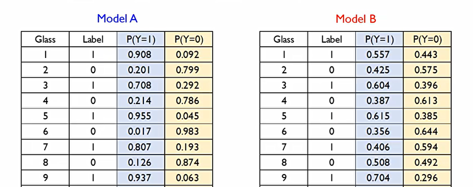 모델 A가 모델 B보다 정답 범주에 속할 확률을 항상 더 높게 산출하기에 모델 A가 더 좋은 모델이다.